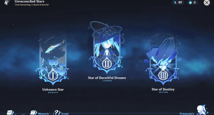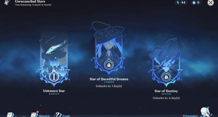 Three Meteoric Wave World Quests will unlock with each unlocked event phase of Unreconciled Stars. Complete these World Quests to obtain rewards such as Fading Star's Might, Fading Star's Essence, Primogems, and Mora.
