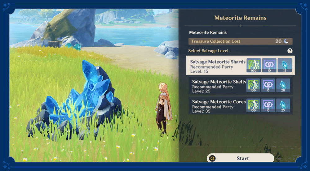 After the salvaging process is completed within the time limit, you may spend 20 Original Resin to salvage the Meteorite Remains and obtain Fading Star's Might as well as character Companionship EXP. You may also claim additional rewards from the event screen after salvaging set amounts of Meteorite Remains.