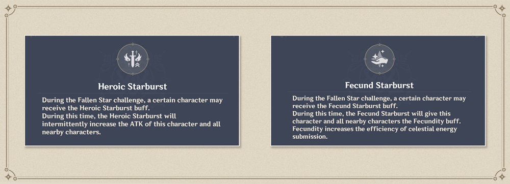 During the Fallen Star challenge, a certain character may randomly receive a special character effect. Possible special effects include Fecund Starburst and Heroic Starburst.