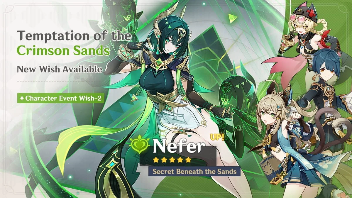 Event Wish "Temptation of the Crimson Sands": Boosted drop rate for "Secret Beneath the Sands" Nefer (Dendro)!
