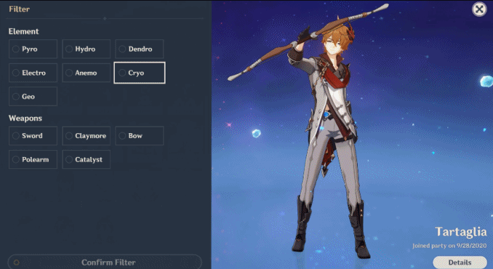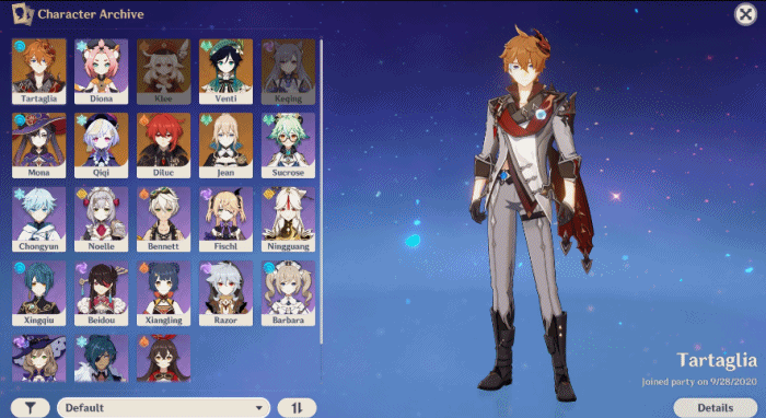 1) In the Character Archive, you can check when exactly each character joined your team. Select the "Details" button for more information on the Attributes, Constellations, and Profile of a selected character.