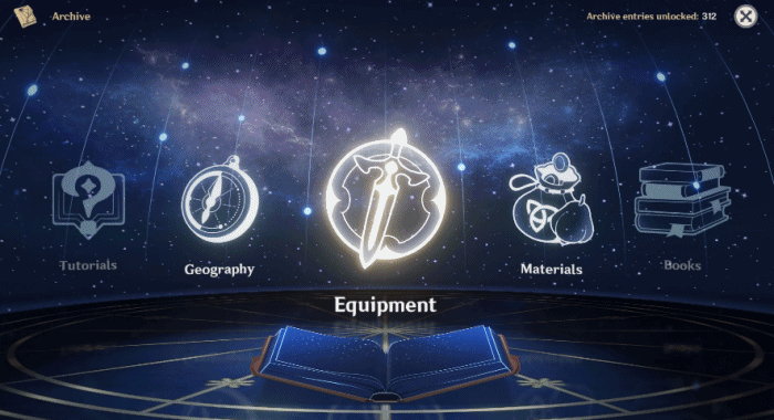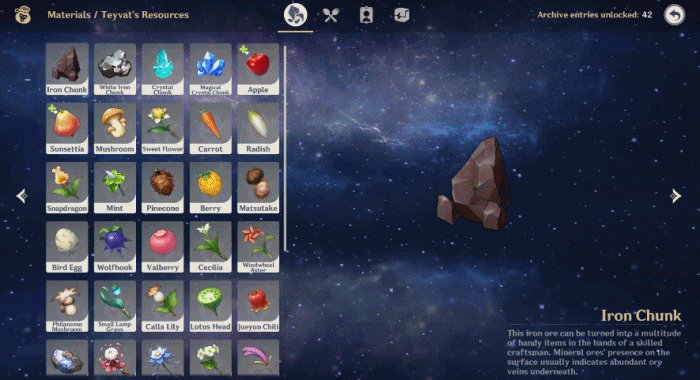 2) In the Materials Archive, you can find entries for resources unique to each region of Teyvat, including: Cooking Ingredients, Food, Potions, Materials, Enhancement and Level Up Materials, and Gadgets.