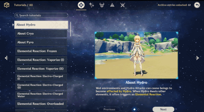 The Tutorials Archive is your go-to place for useful tips about "Elemental Reactions", "Enemies", "System", and "Adventure". Look there for all the tutorials you have triggered during your travels.