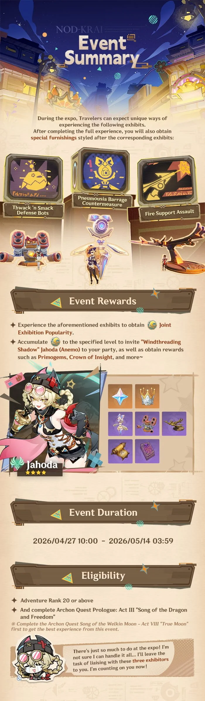 The "Where Waves Meet the Reef" event and story will be available from 2026/04/27 10:00. Take part in the event to invite "Windthreading Shadow: Jahoda (Anemo)" to your party, as well as obtain rewards such as Primogems, Crown of Insight, and more.