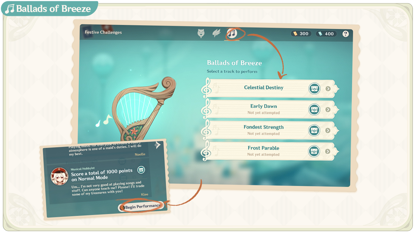 During the event, the Traveler can take part in three challenges: "Bullseye Balloons," "Floral Freefall," and "Ballads of Breeze." Complete the corresponding challenges to obtain Festive Tour Tickets and rewards from various characters.