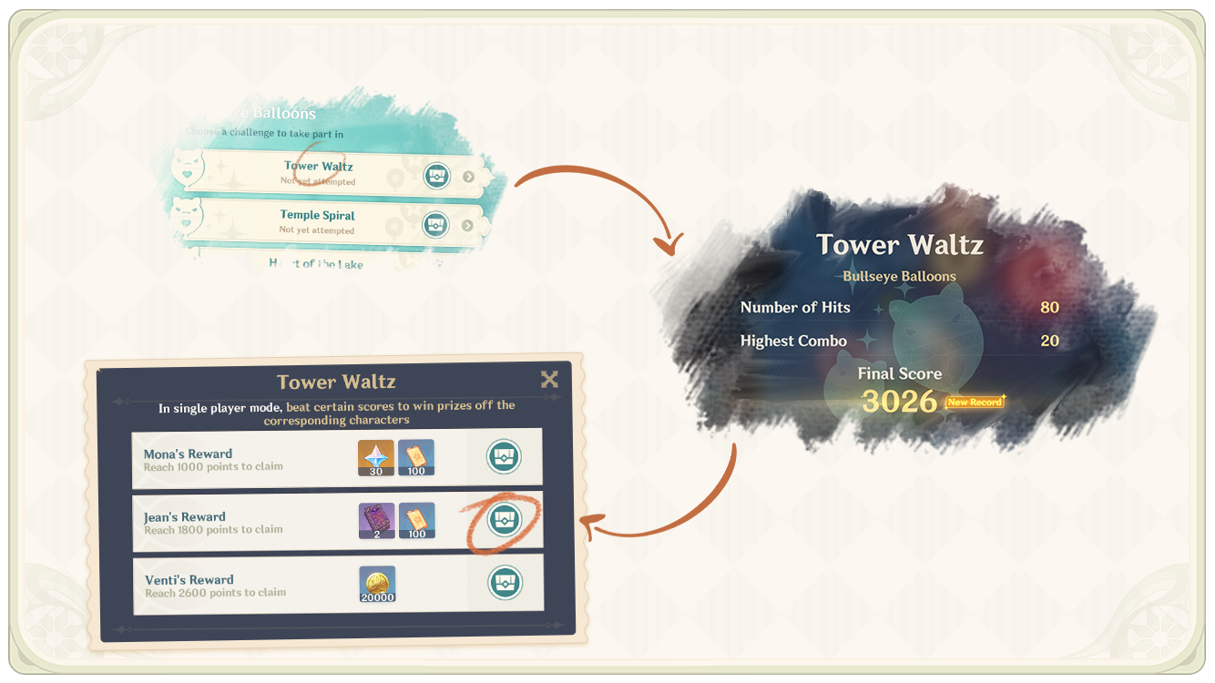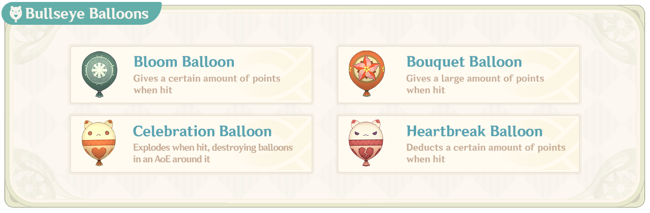 Tip: During this challenge, only Normal and Charged Attacks can be used to pop the balloons (Aimed Shots are considered Charged Attacks). We recommend that you use characters who specialize in using Bows to take part in this challenge, Travelers~