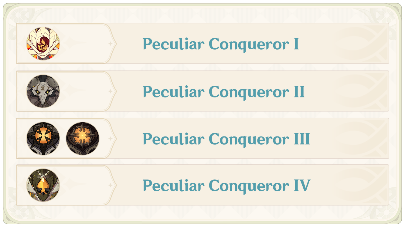 Additionally, completing Peculiar Conqueror tasks will allow you to obtain Primogems, Talent Enhancement Materials, Mora, and other rewards! You can view the details of the Peculiar Conqueror tasks from the event page.
