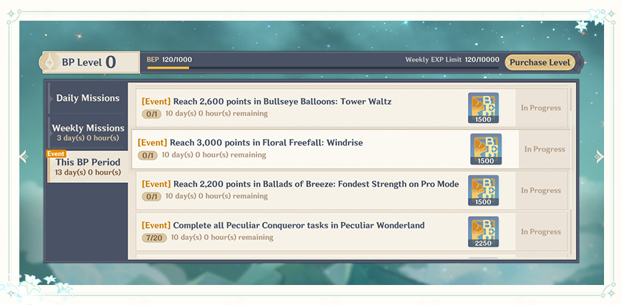 New event-related missions have also been added to "Windborne Blossoms." Complete them to receive BEP.