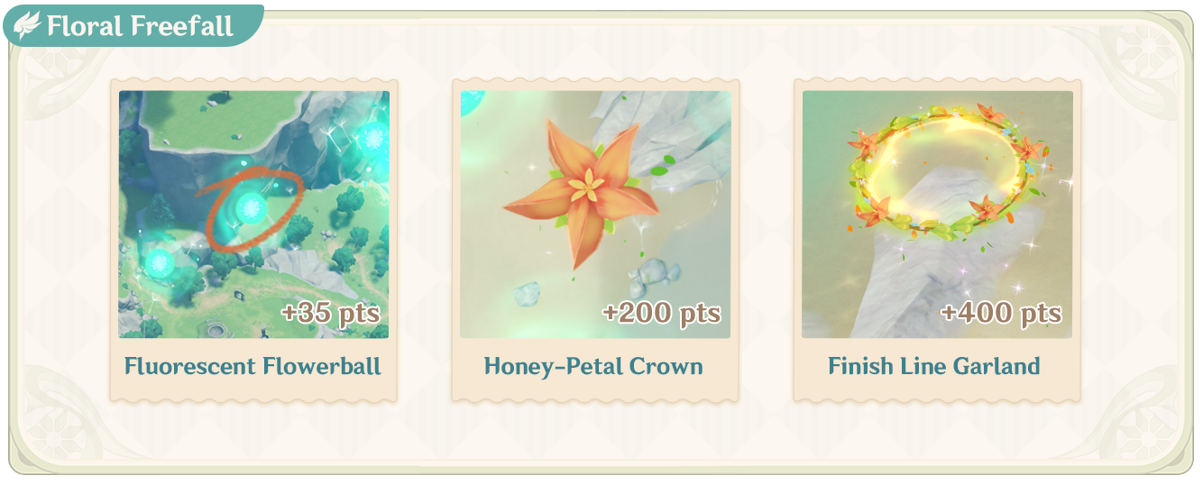 Travelers will have to leap down from a high platform and collect the Flower Balls floating in the skies. Different Flower Balls will award different amounts of points. Other than this, the amount of challenge time remaining will be converted into points. Each second is worth 1 point, and you can gain up to 10 additional points.