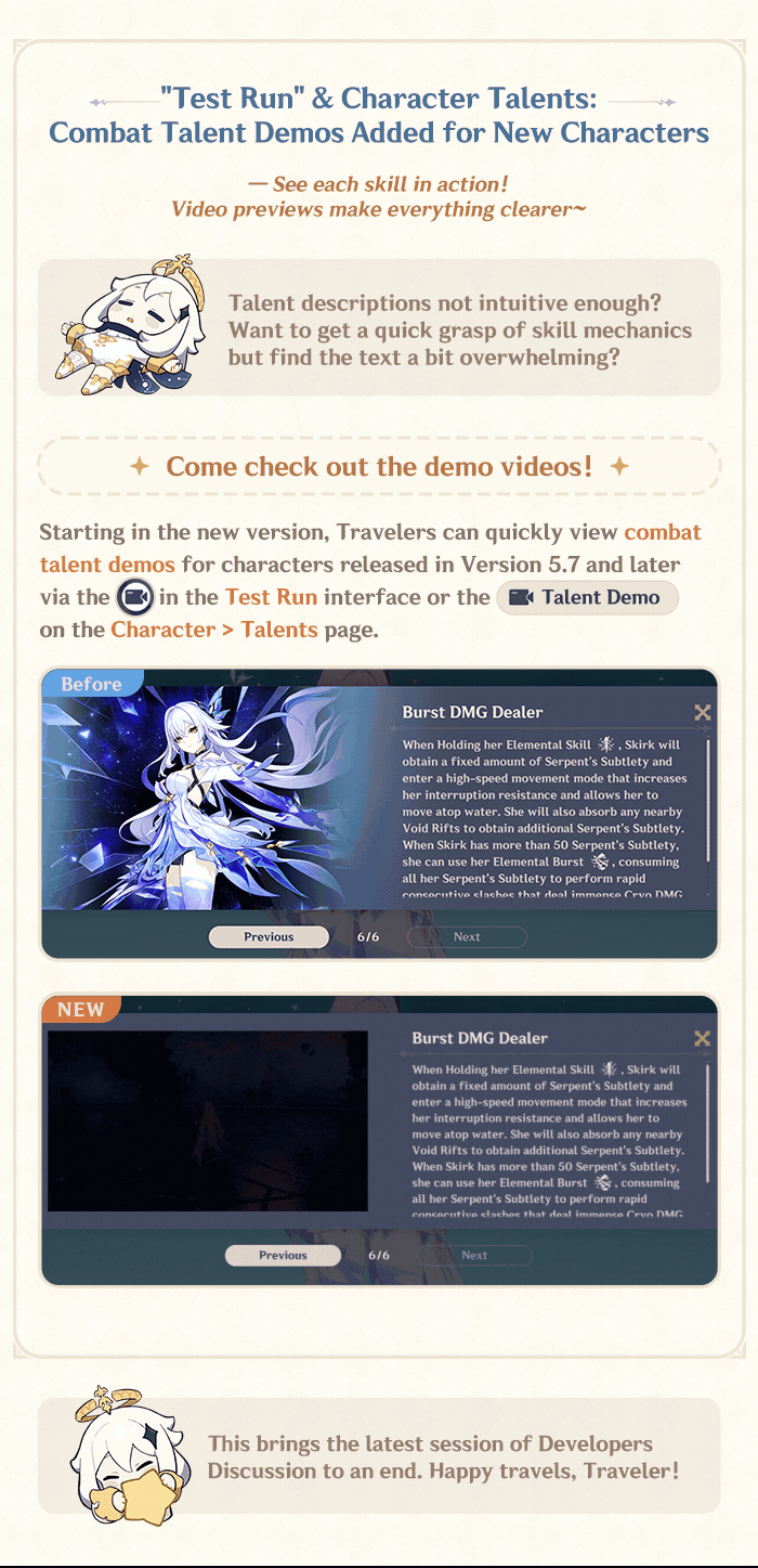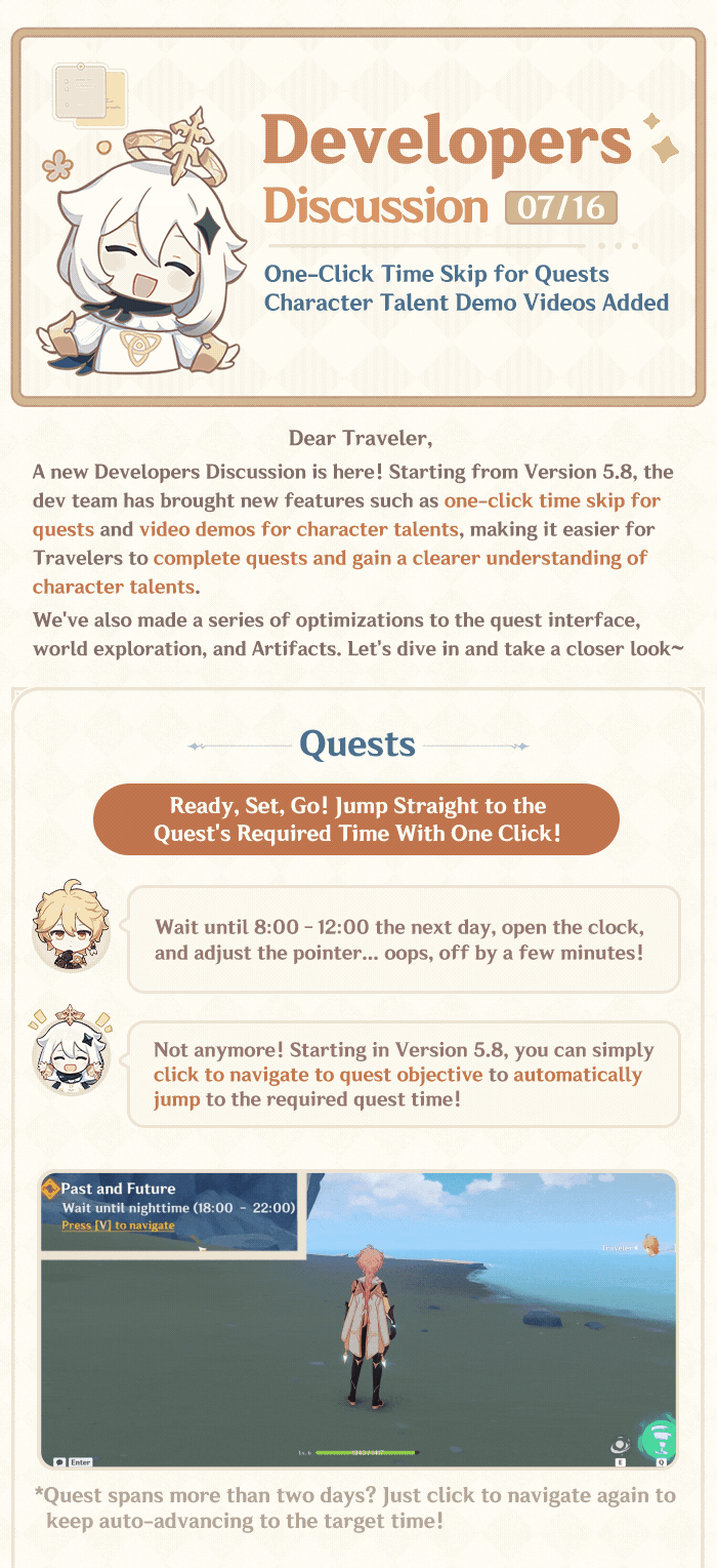 There is a new Developers Discussion available! To make it easier for travelers to finish quests and better grasp character talents, the development team introduced new features starting with Version 5.8, including as one-click time skip for missions and video demos for character abilities. We have also made a number of improvements to Artifacts, world exploration, and the quest interface. Let's get started and examine it more closely.