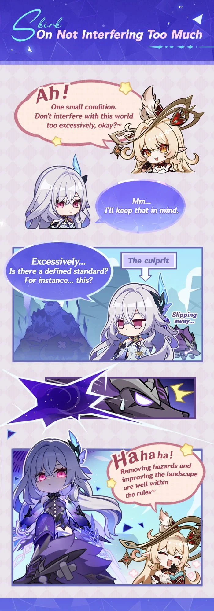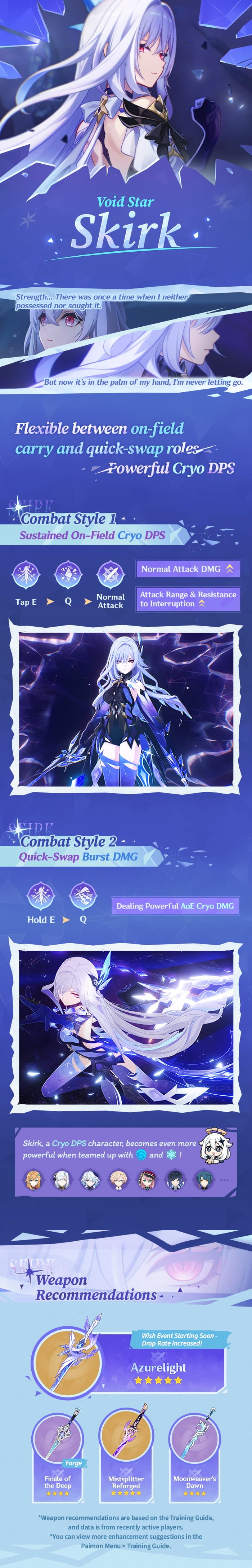 Hello, Traveler! Skirk is a powerful warrior. Since arriving in Teyvat, the people she's met and the experiences she's had have given her a new perspective on life and on her own heart. Here are some short notes on Skirk. Let's take a look!