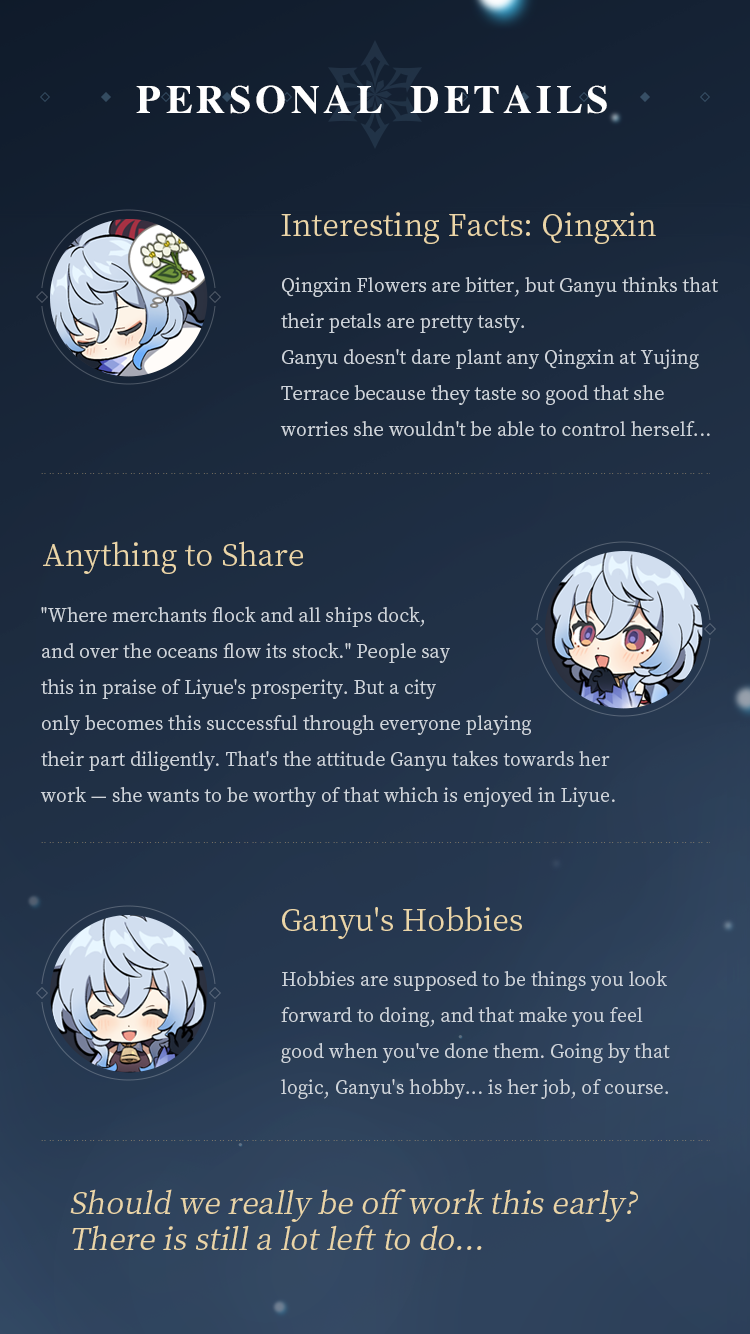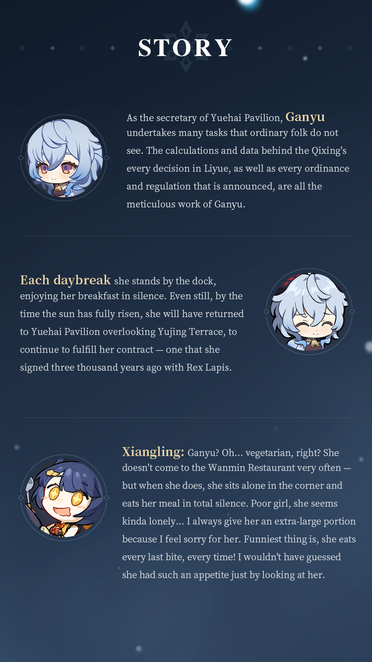 The calculations and data behind the Qixing's every decision in Liyue, as well as every ordinance and regulation that is announced, are all the meticulous work of Ganyu. But beneath this model of hard work and efficiency lies a side of her that likes to eat...