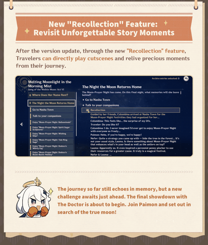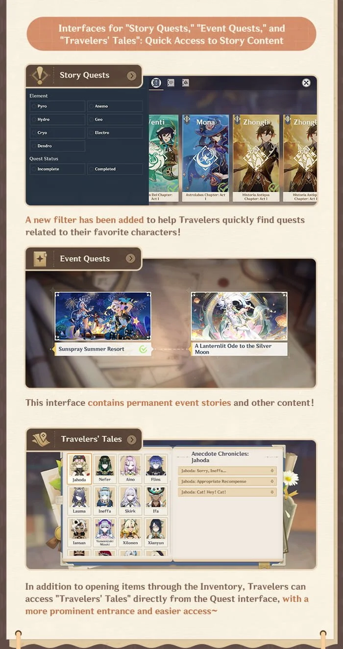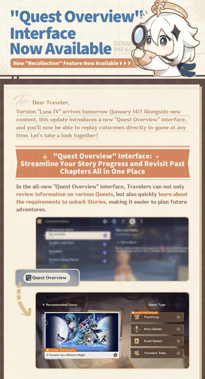Dear Traveler, Version "Luna IV" arrives tomorrow (January 14)! Alongside new content, this update introduces a new "Quest Overview" interface, and you'll now be able to replay cutscenes directly in-game at any time. Let's take a look together!