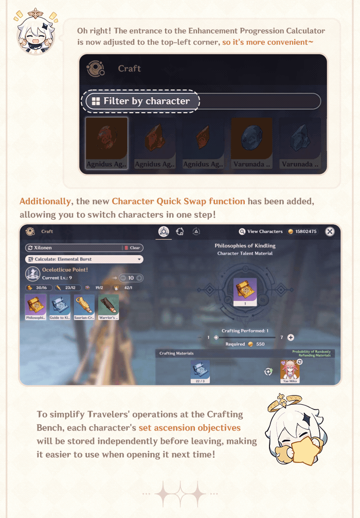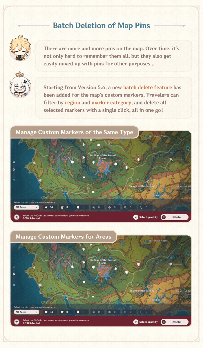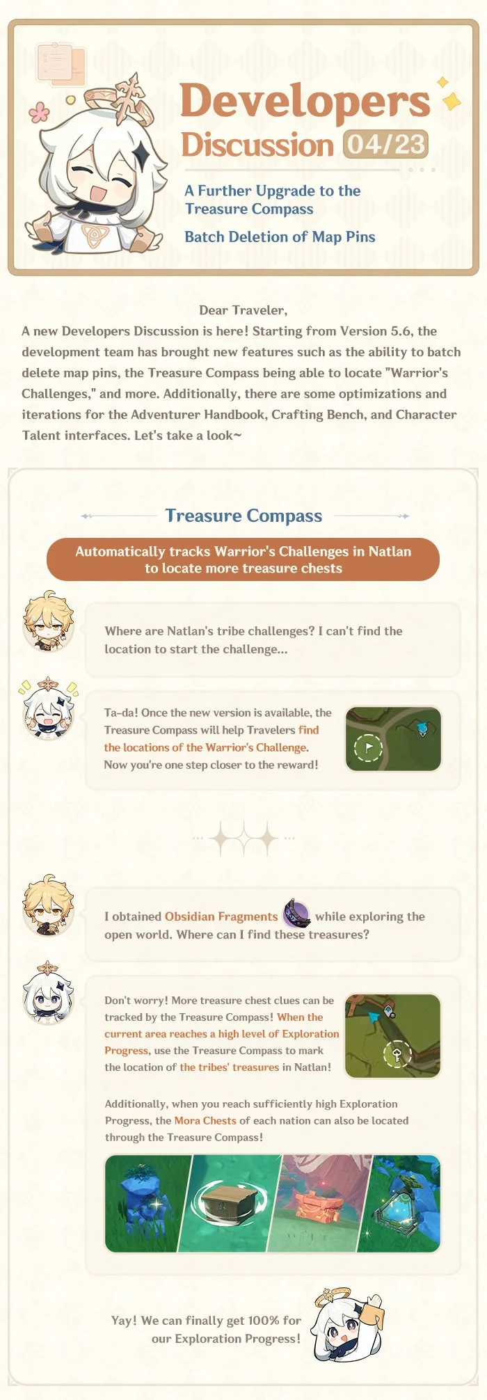 A new Developers Discussion is here! Starting from Version 5.6, the development team has brought new features such as the ability to batch delete map pins, the Treasure Compass being able to locate "Warrior's Challenges," and more. Additionally, there are some optimizations and iterations for the Adventurer Handbook, Crafting Bench, and Character Talent interfaces. Let's take a look~