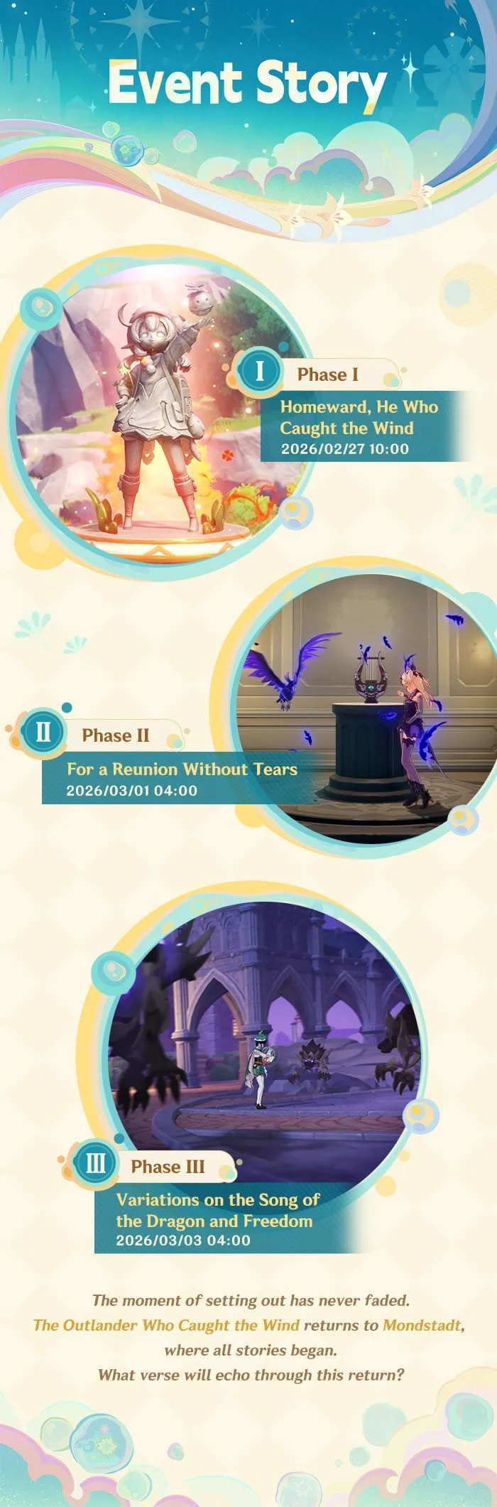 The "Homeward, He Who Caught the Wind" event and story will begin on February 27, 2026, at 10:00 (Server Time). Participate to obtain the weapon appearance "Phantasmal Gift: Star Omen," as well as Primogems, Crown of Insight, and additional rewards.