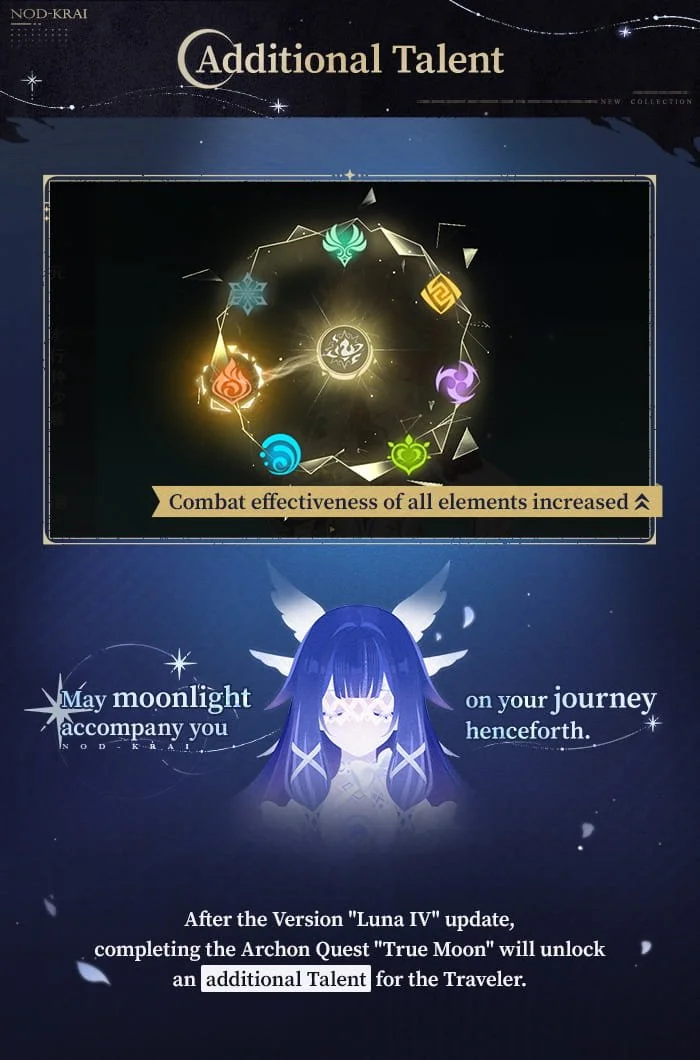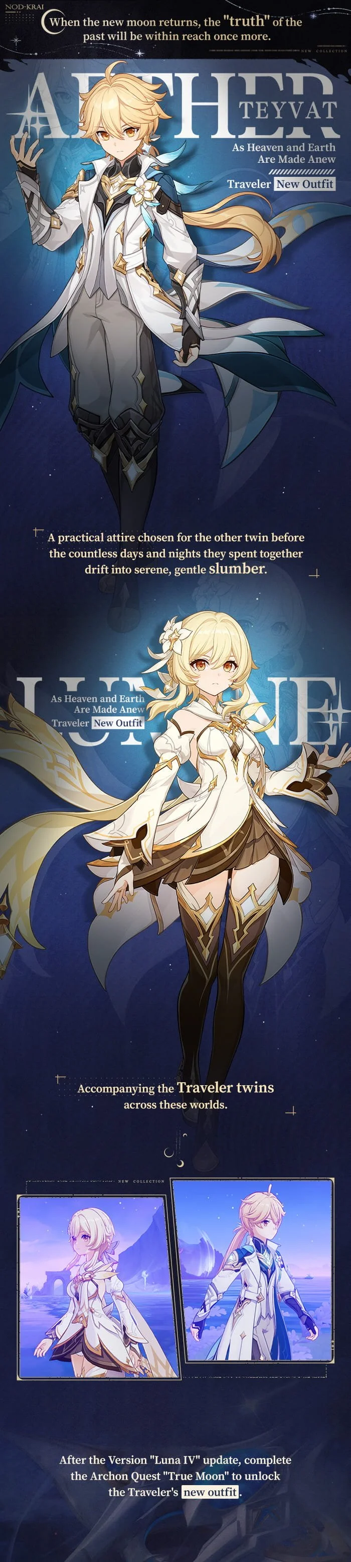 After the Version "Luna IV" update, complete the Archon Quest "True Moon" to unlock the Traveler's new outfit "As Heaven and Earth Are Made Anew" and an additional Talent.