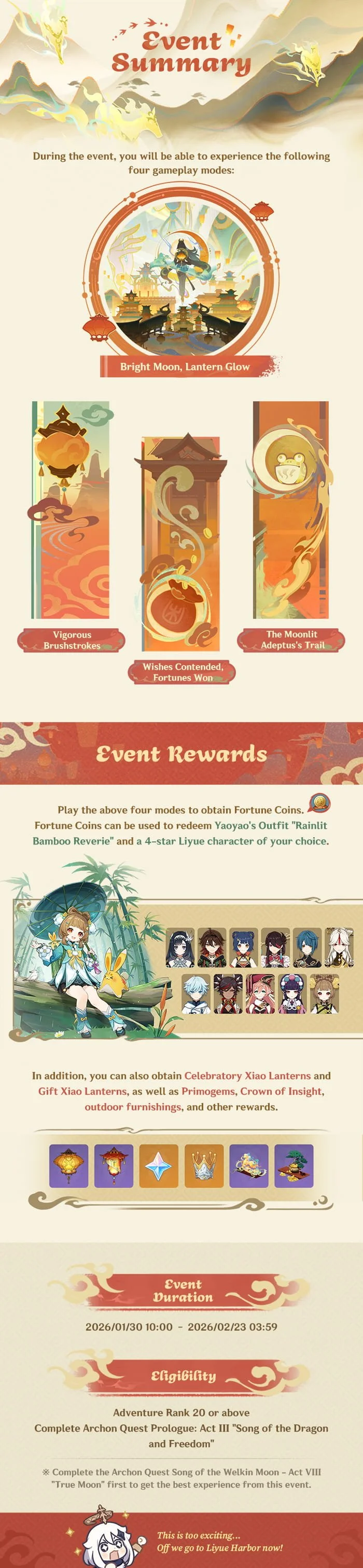 The "A Lanternlit Ode to the Silver Moon" event and storyline will begin on 2026/01/30 at 10:00. Take part in this event to redeem a Yaoyao outfit, get a 4-star Liyue character of your choice, and obtain rewards such as Primogems, Crown of Insight, outdoor furnishings, and more!