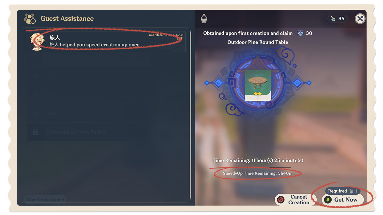 If your friend has a furnishing that is in the process of being crafted, interacting with the teapot spirit in their Serenitea Pot will help to speed up the furnishing's crafting progress. This helps your friend reduce the creation time for furnishings by a certain amount. You can provide assistance to multiple friends each day, but the same person cannot be assisted twice.