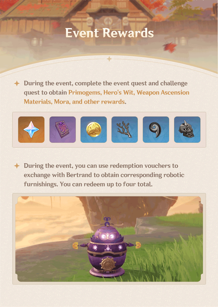 During the event, help Bertrand, a Fontaine mechanical toymaker in Inazuma, gather materials and build test products to obtain redemption vouchers. Use redemption vouchers to exchange for robotic furnishings. Complete the designated challenges to obtain Primogems, Hero's Wit, Weapon Ascension Materials, Mora, and other rewards.