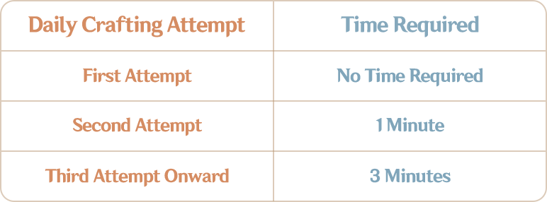 2. Each first crafting attempt of the day (refreshes at 00:00 each day according to your server time) does not require any time to complete. But from the second crafting attempt onward, you will have to wait a set amount of time for crafting to complete:
