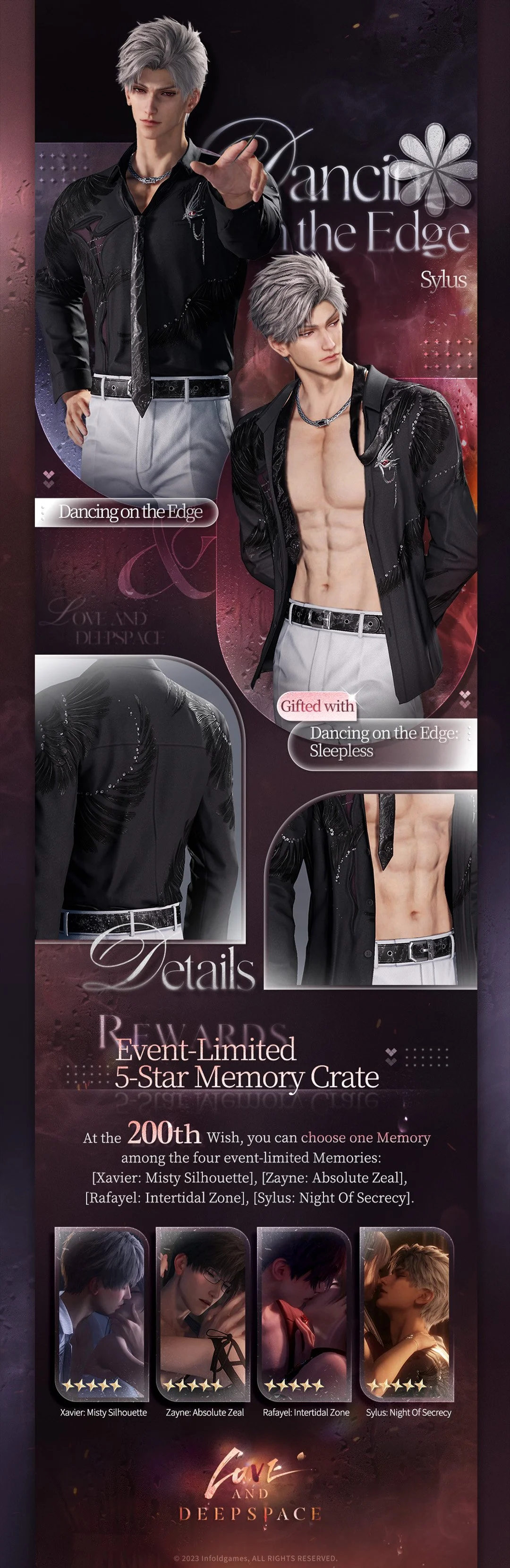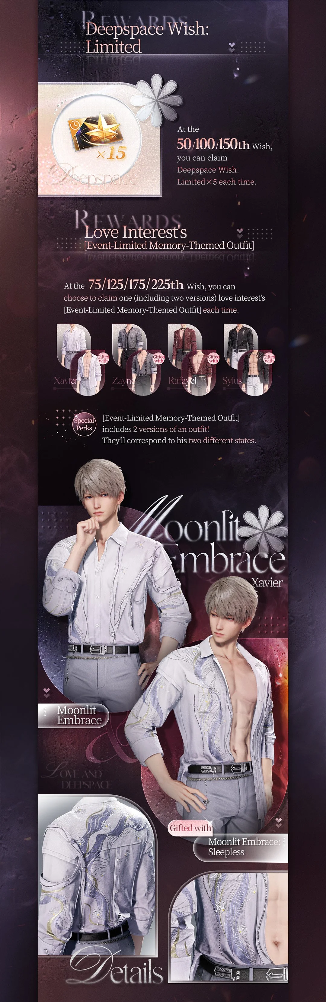 At the 200th Wish, you can choose one Memory among the four event-limited Memories: [Xavier: Misty Silhouette], [Zayne: Absolute Zeal], [Rafayel: Intertidal Zone], [Sylus: Night Of Secrecy].