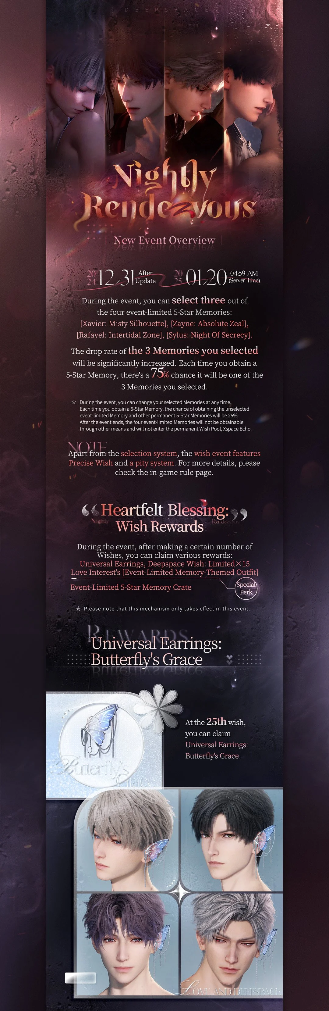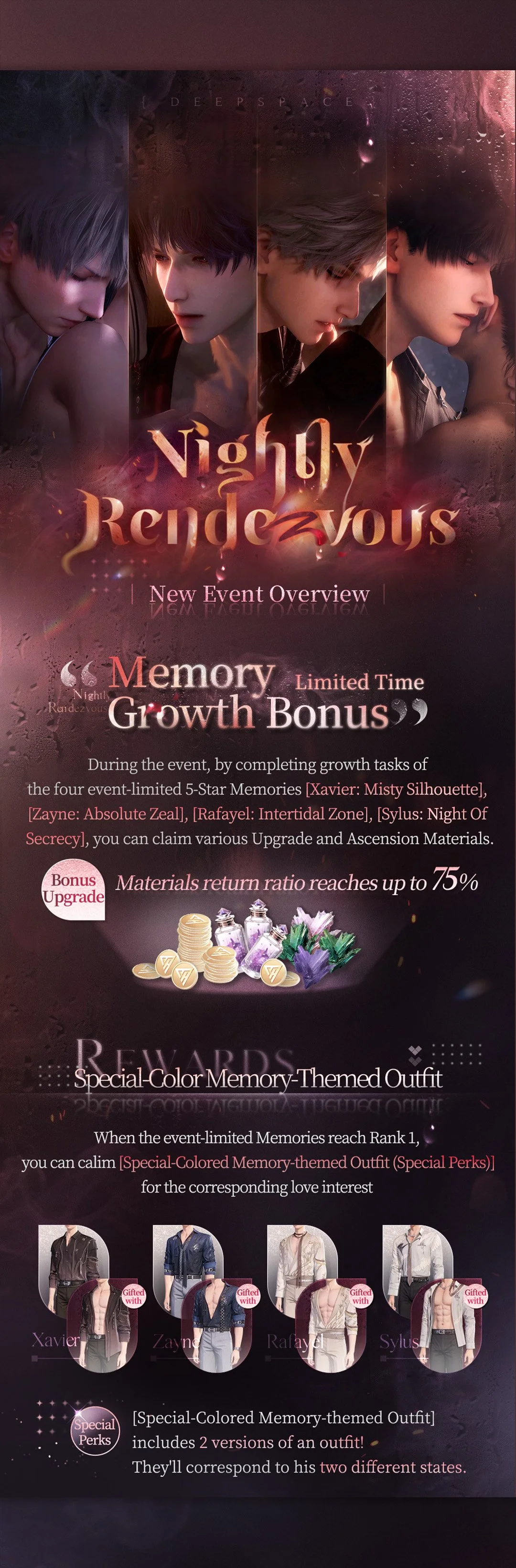 1. During the event, you can select three out of the four event-limited 5-Star Memories: [Xavier: Misty Silhouette], [Zayne: Absolute Zeal], [Rafayel: Intertidal Zone], [Sylus: Night Of Secrecy]. The drop rate of the 3 Memories you selected will be significantly increased. Each time you obtain a 5-Star Memory, there's a 75% chance it will be one of the 3 Memories you selected.