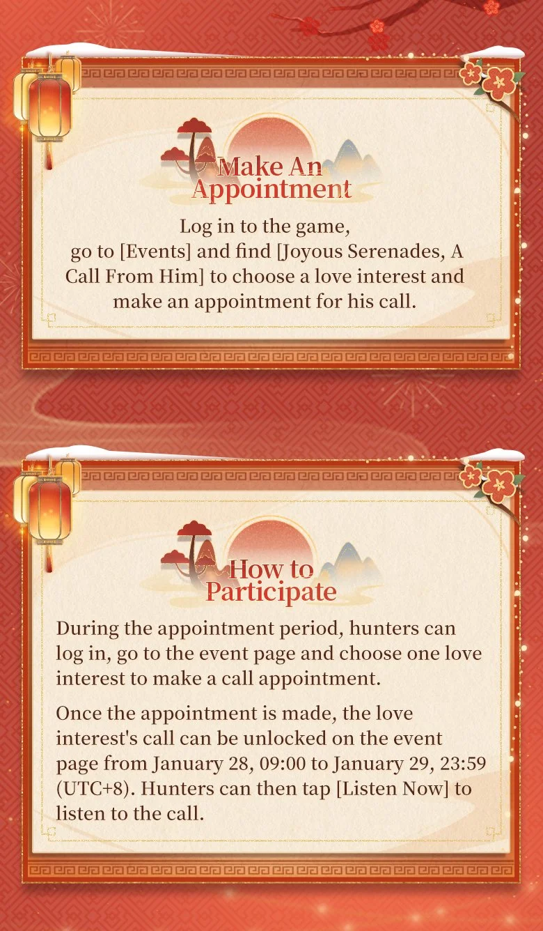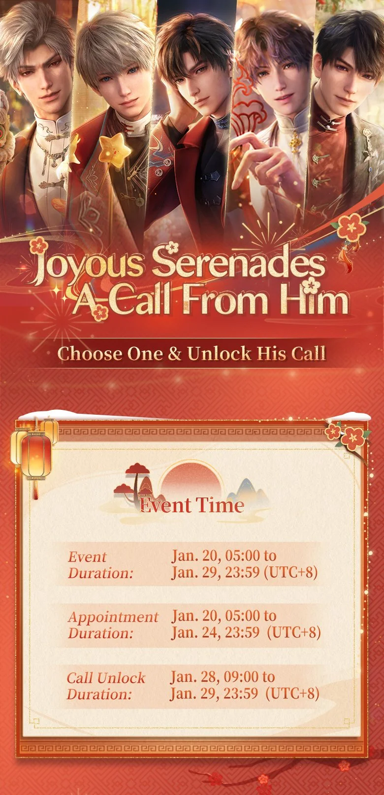 Log in to the game, go to [Events] and find [Joyous Serenades, A Call From Him] to choose a love interest and make an appointment for his call.