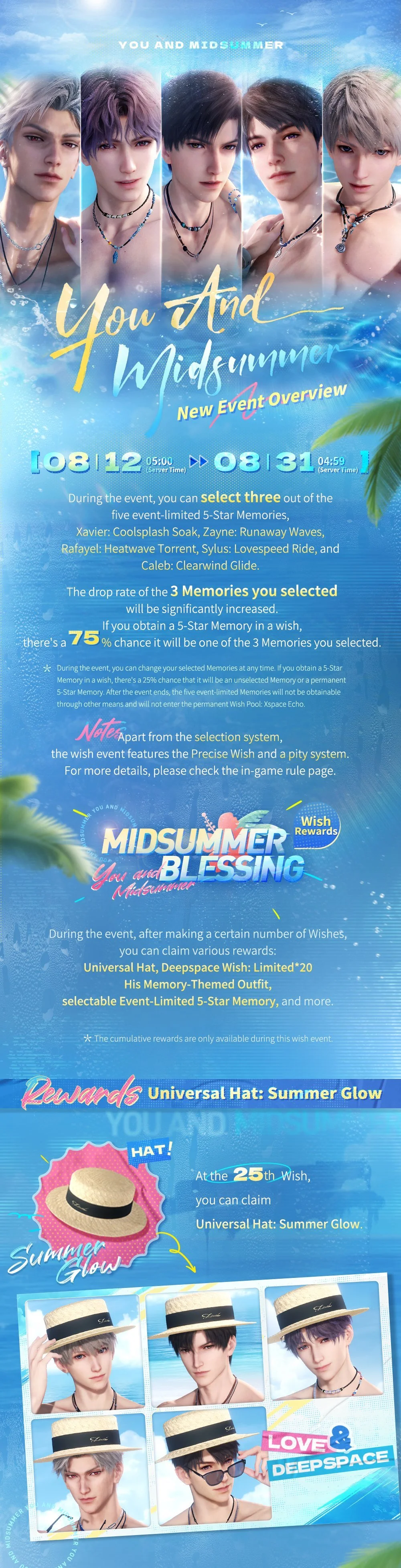 1. [Xavier: Coolsplash Soak], [Zayne: Runaway Waves], [Rafayel: Heatwave Torrent], [Sylus: Lovespeed Ride], and [Caleb: Clearwind Glide] are the five event-limited 5-Star Memories from which you can choose three. The three memories you have chosen will descend at a much higher rate. You have a 75% chance of getting one of the three Memories you chose each time you get a 5-Star Memory.