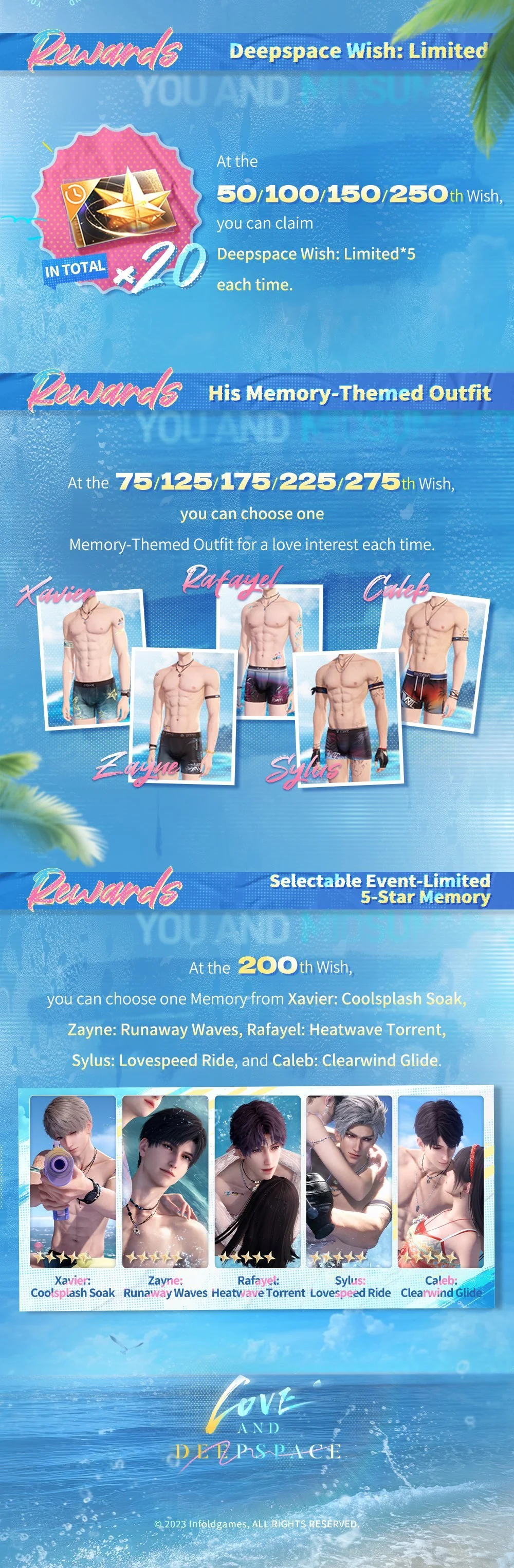You can select one Memory from [Caleb: Clearwind Glide], [Sylus: Lovespeed Ride], [Rafayel: Heatwave Torrent], [Zayne: Runaway Waves], and [Xavier: Coolsplash Soak] during the 200th Wish.