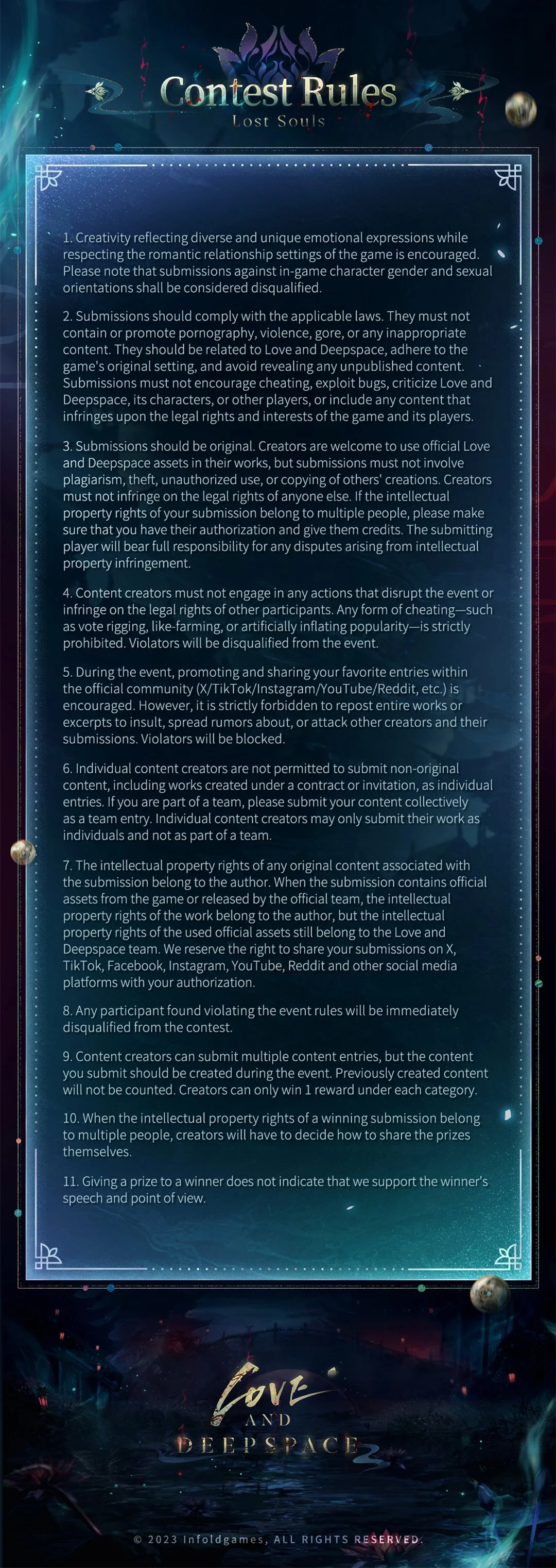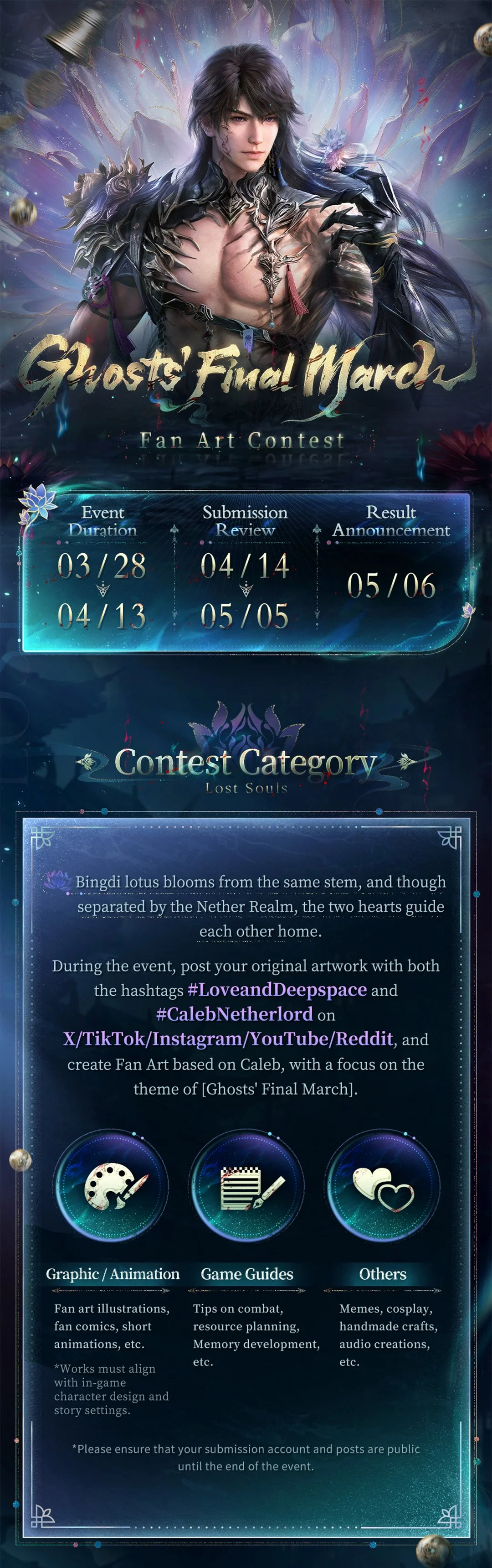 During the event, post your original artwork with both the hashtags #LoveandDeepspace and #CalebNetherlord on X/TikTok/Instagram/YouTube/Reddit, and complete the submission form as required.