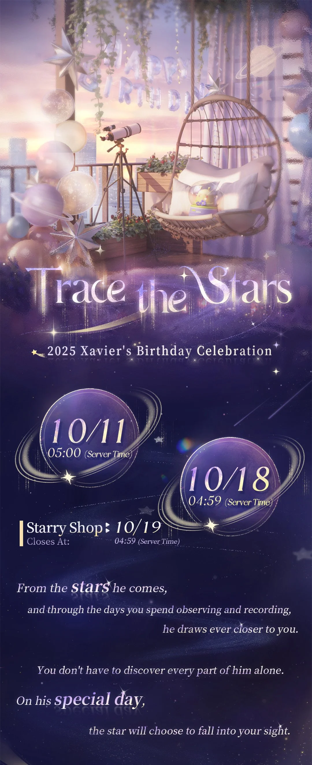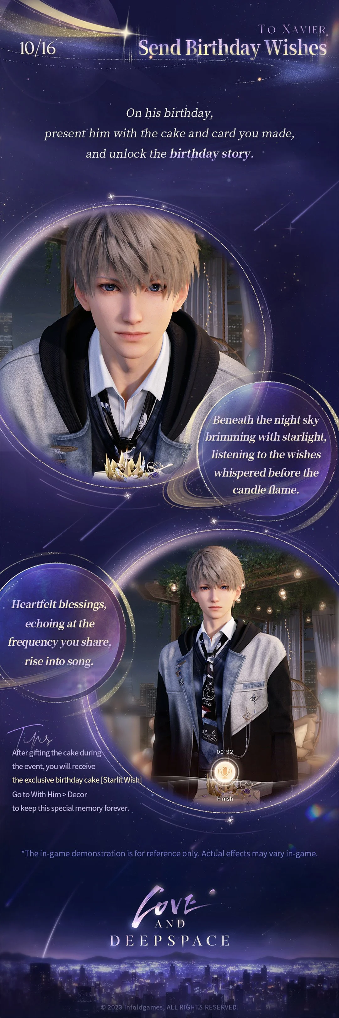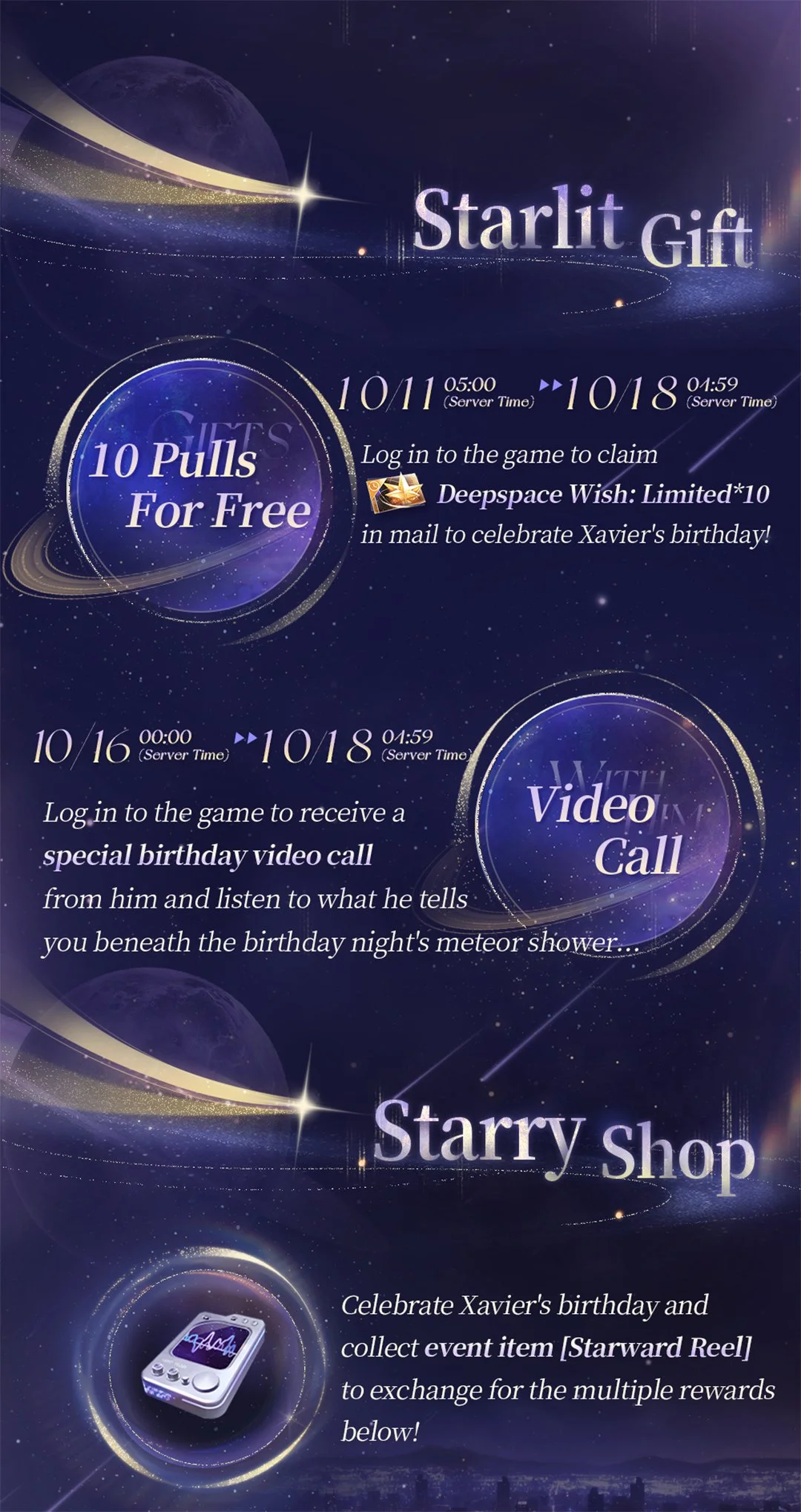 From 05:00 on Oct. 11 to 04:59 on Oct. 18 (server time), log in to the game to claim [Deepspace Wish: Limited*10] in Mail to celebrate Xavier's birthday!