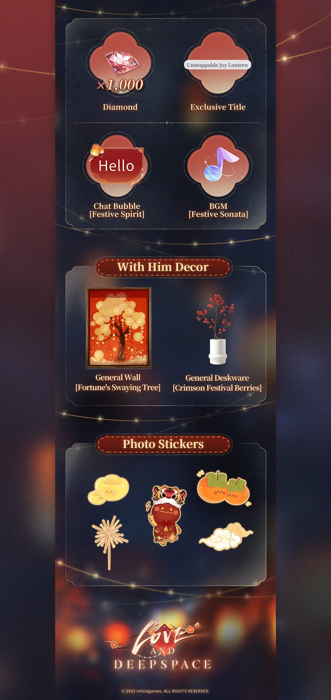 Join the events above, and collect a specified number of Fortune Ingots to claim [Diamond*500]. You can also exchange Fortune Ingots for rewards like [Festive Blessing] 4-Star Memory*5, Diamond*1000, "My" Outfit: Spring's Bounty, "My" Hat: Picnic Keepsake, "My" Earrings: Twin Blooms, Wall: Fortune's Swaying Tree, Deskware: Crimson Festival Berries, Title: Unstoppable Joy Lantern, Chat Bubble: Festive Spirit, Background Music: Festive Sonata and photo stickers!