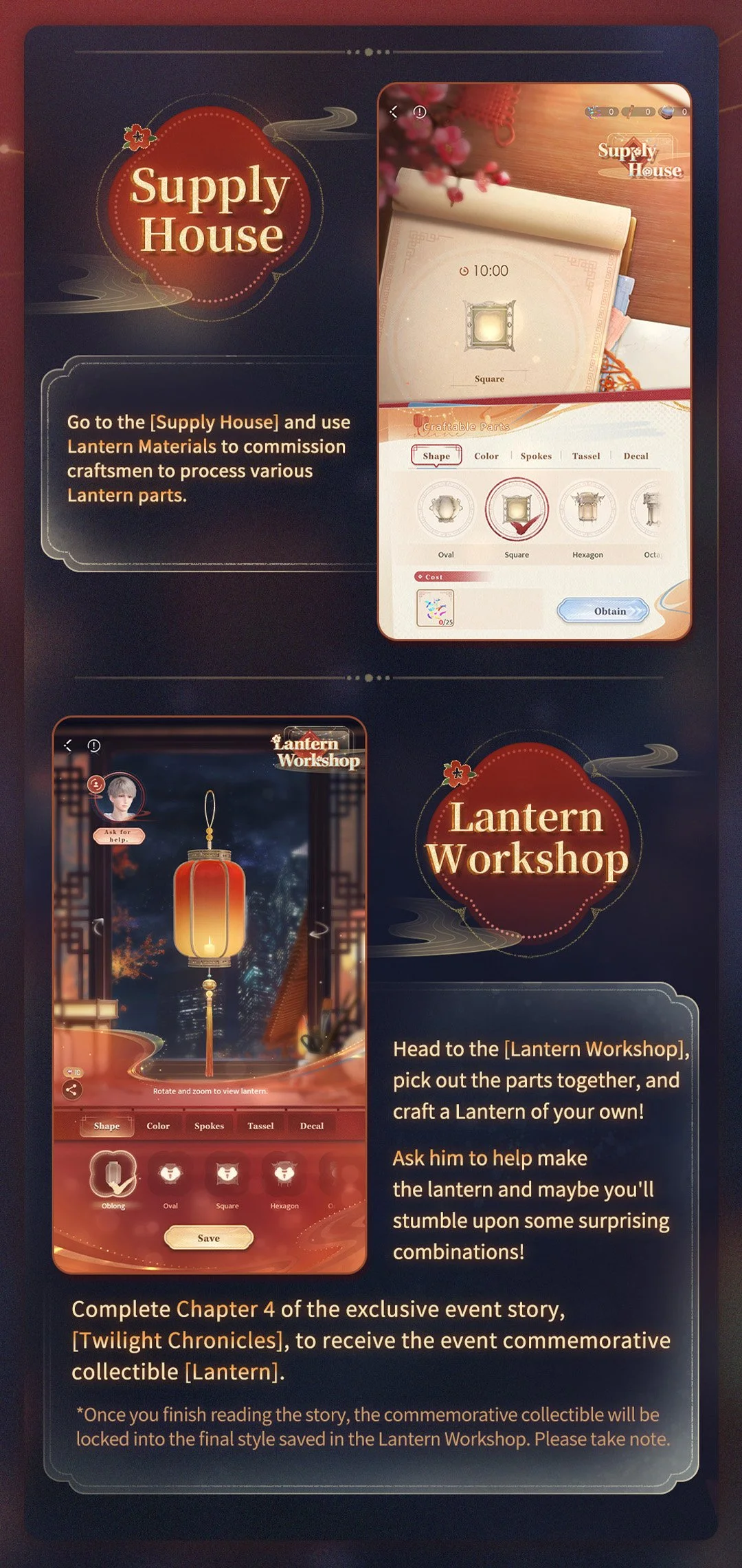 Clear the event combat stages, collect lantern materials, and process them into various lantern parts. Then, you can create your own exclusive lantern together with him!