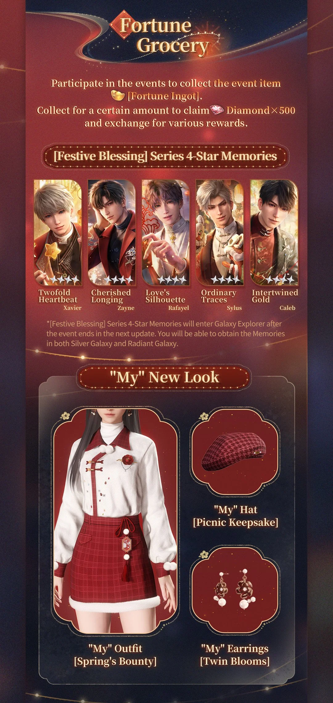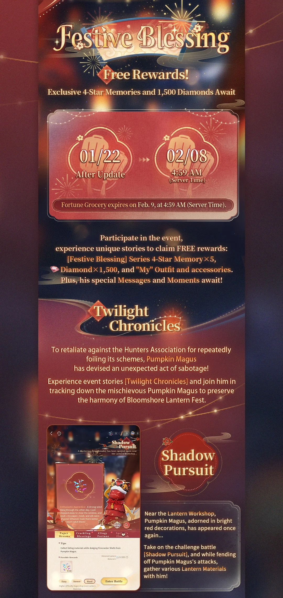 Join the event to experience the exclusive event story, and get rewards including [Festive Blessing] 4-Star Memory*5, Diamond*1,500, and "My" Outfit! Special Text Messages and Moment Posts also wait for you to explore!