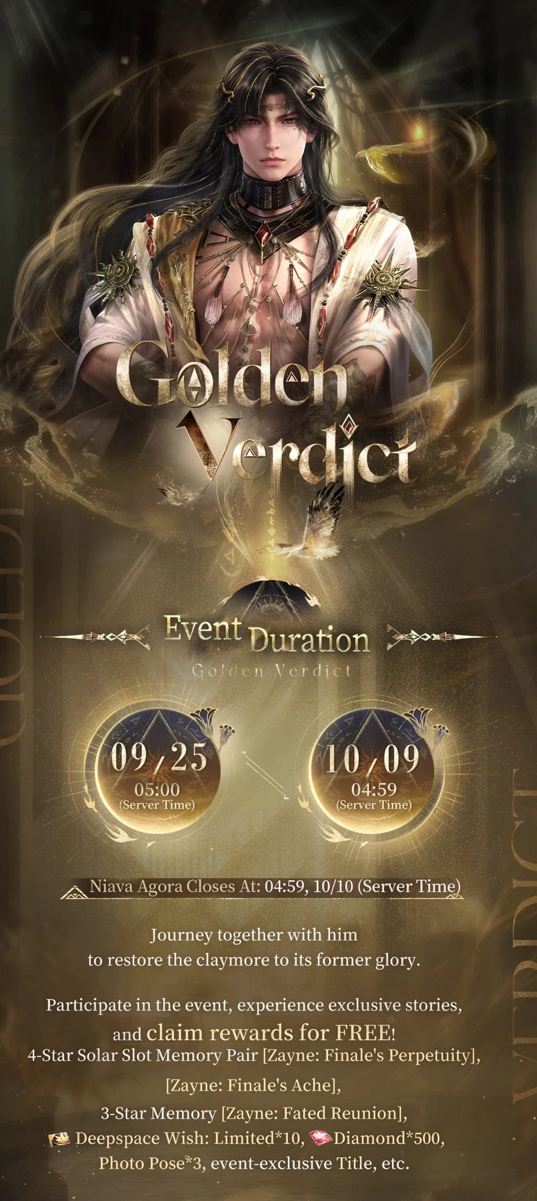 Get the 4-Star Solar-Slot Memory Pair [Zayne: Finale's Perpetuity] and [Zayne: Finale's Ache], 3-Star Memory [Zayne: Fated Reunion], [Deepspace Wish: Limited*10], [Diamond*500], [Photo Pose*3], Event-exclusive Title, and more prizes for free by attending the event!