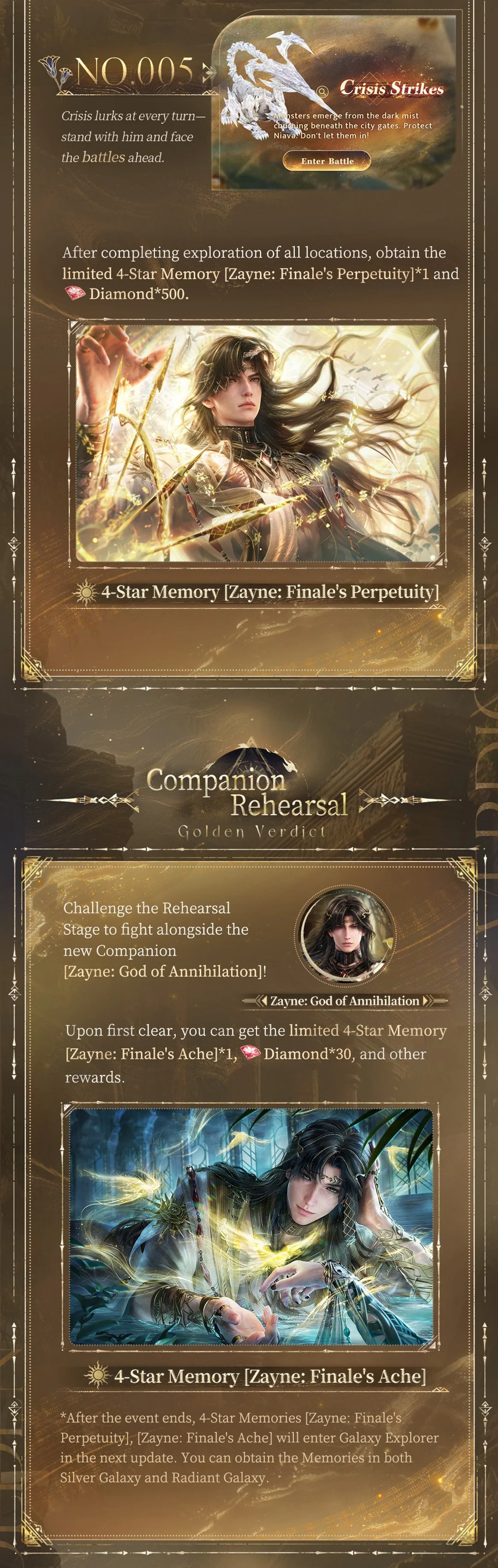 * Following the event, Zayne's 4-Star Memory Pair [FL] will be added to [Galaxy Explorer] in the initial update. You can get them by investigating the Radiant Galaxy and Silver Galaxy.