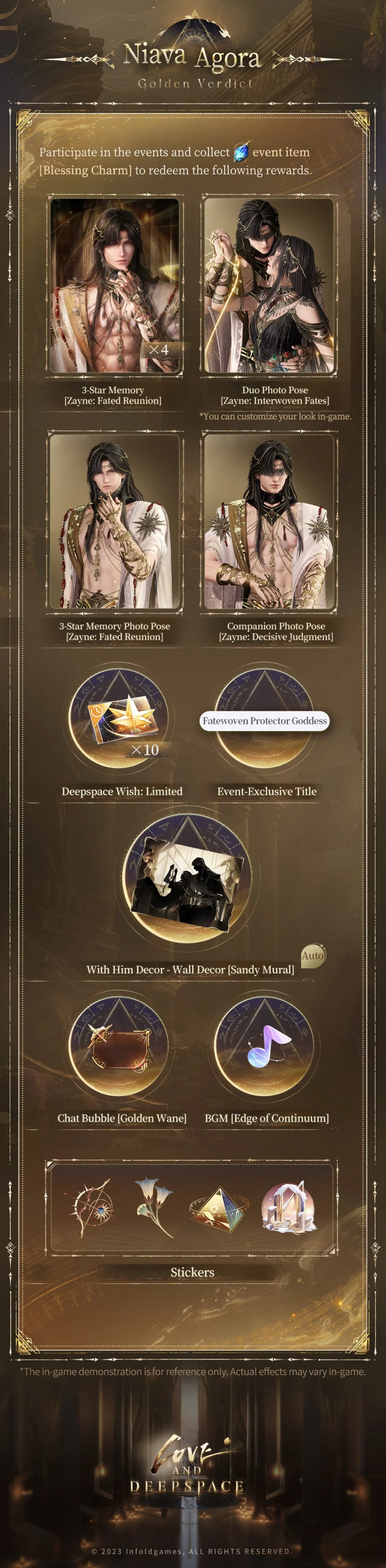 Limited 3-Star Memory [Zayne: Fated Reunion], [Deepspace Wish: Limited*10], Duo Photo Pose [Zayne: Interwoven Fates], Event-Exclusive Title [Fatewoven Protector Goddess], 3-Star Memory and Companion Photo Poses [Zayne: Fated Reunion], [Zayne: Decisive Judgment], Chat Bubble [Golden Wane], BGM [Edge of Continuum], Stickers, and more!