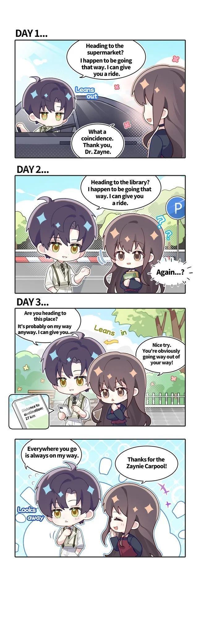 Every time you see Zayne, he "happens to be going the same way," subtly prolonging your time together.