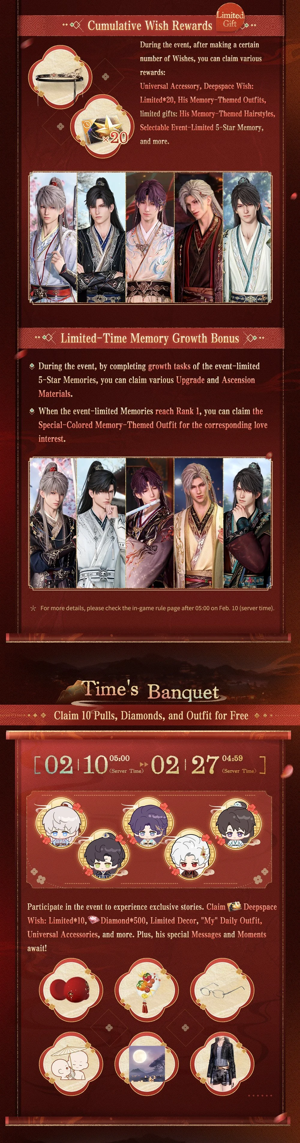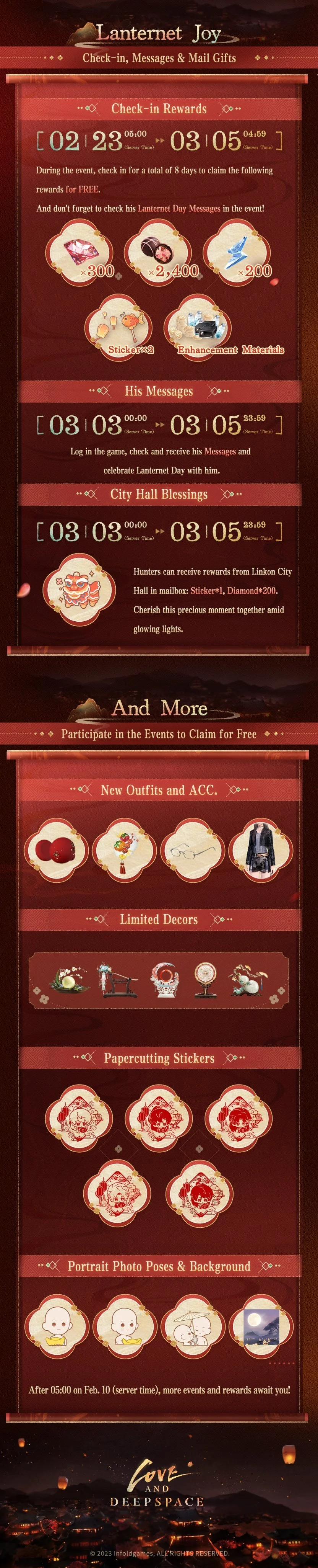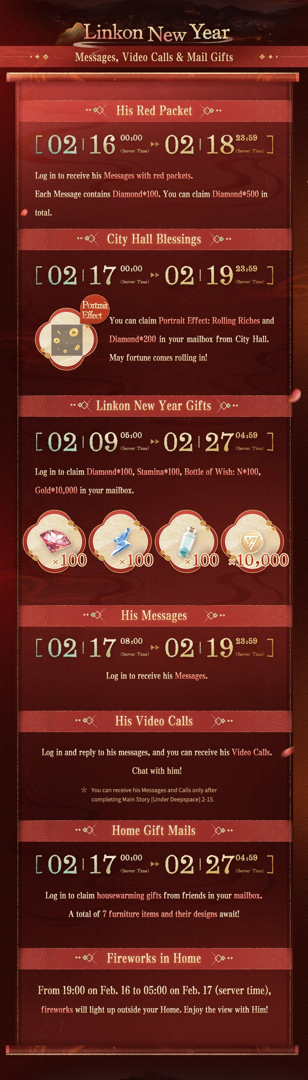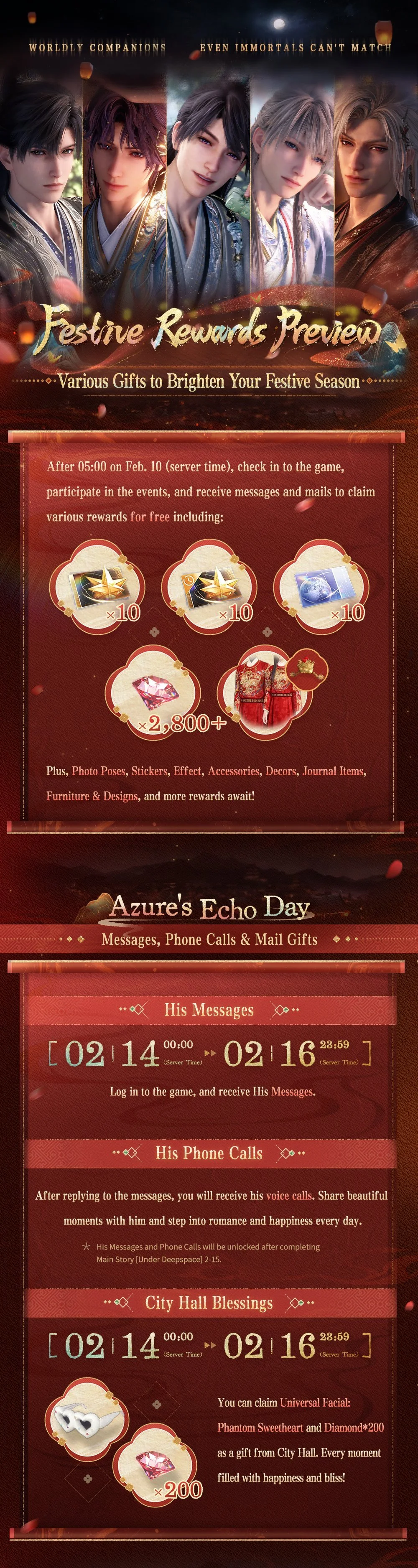 After 05:00 on Feb. 10 (server time), check in to the game, participate in the events, and receive messages and mails to claim various rewards for free including: [30 Pulls, Diamond*2,800+, His and "My" God of Wealth outfit sets], "My" Outfit, Photo Poses, Stickers, Effect, Accessories, Decors, Journal Items, Furniture & Designs, and more rewards await!