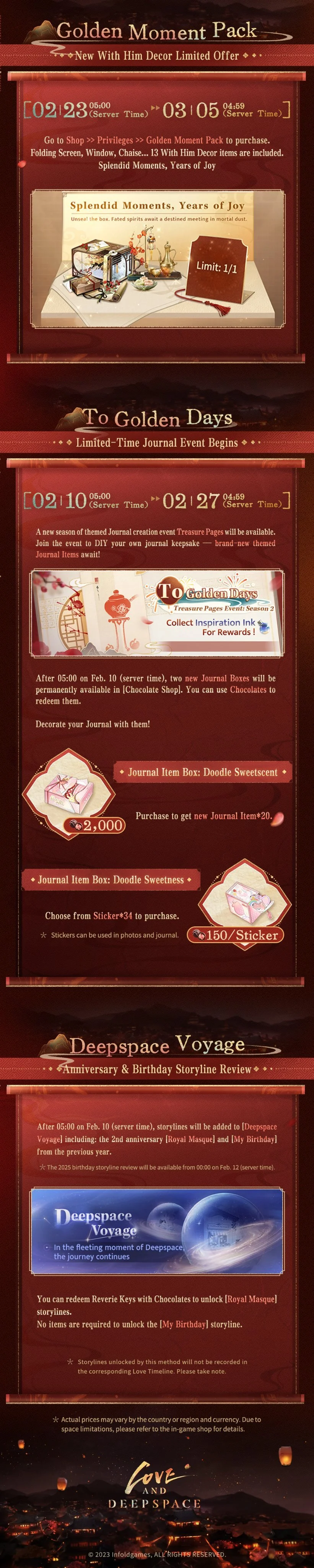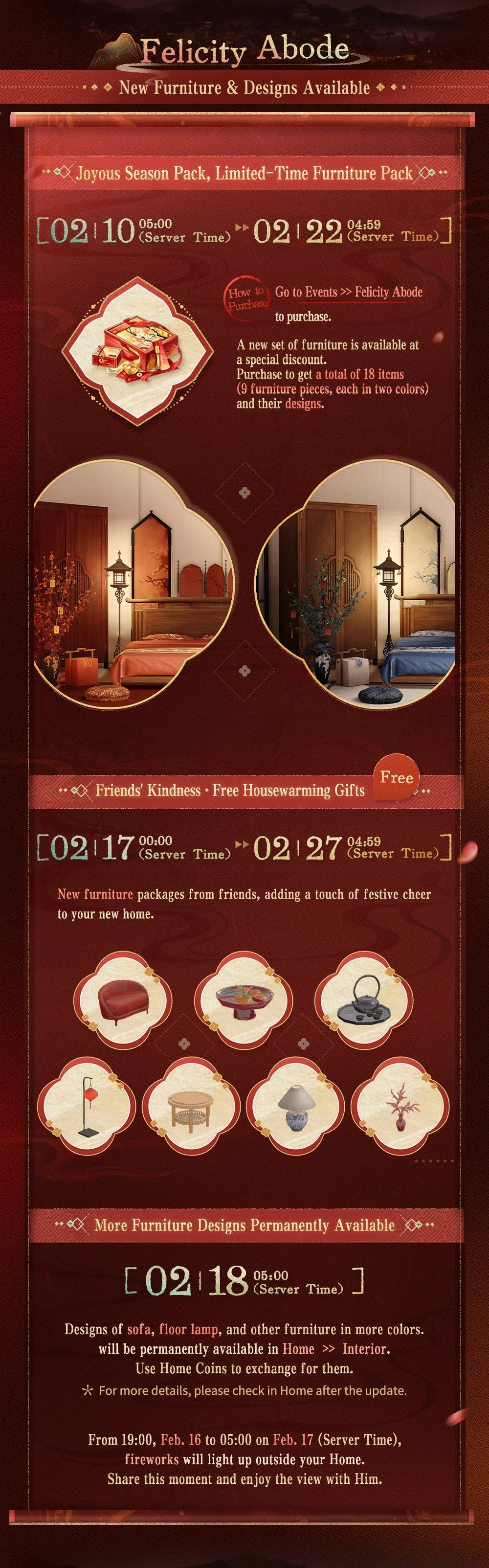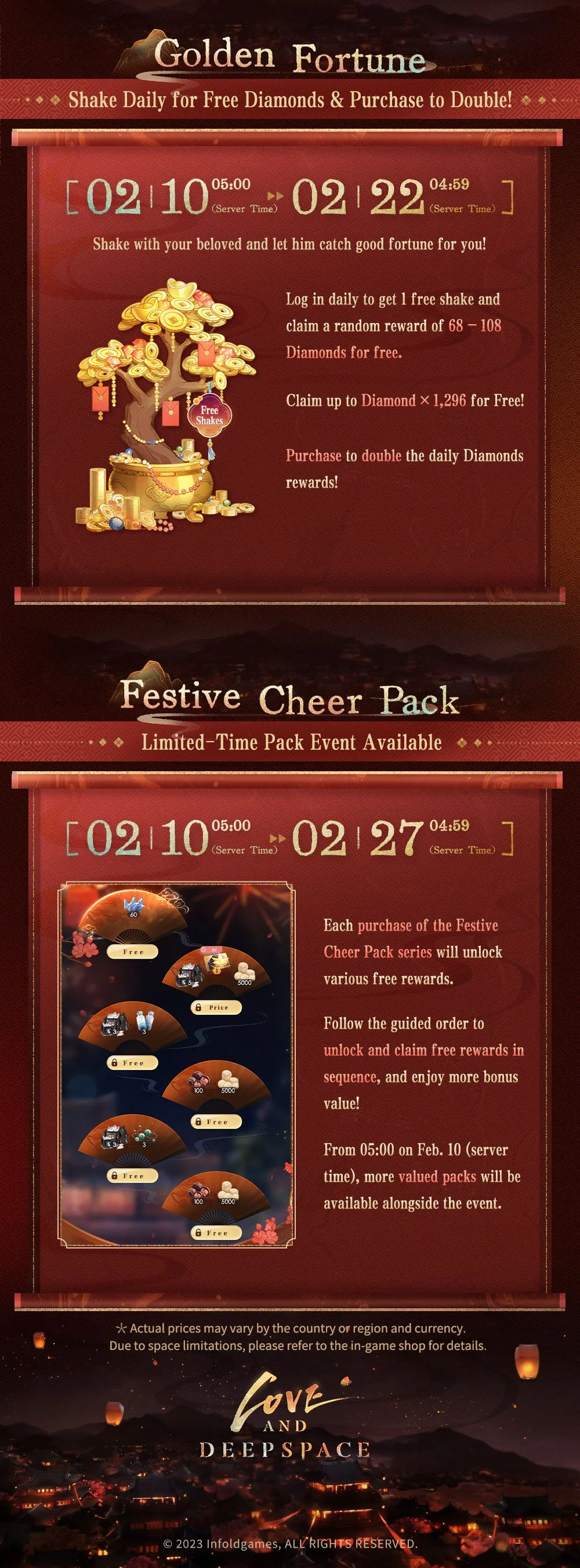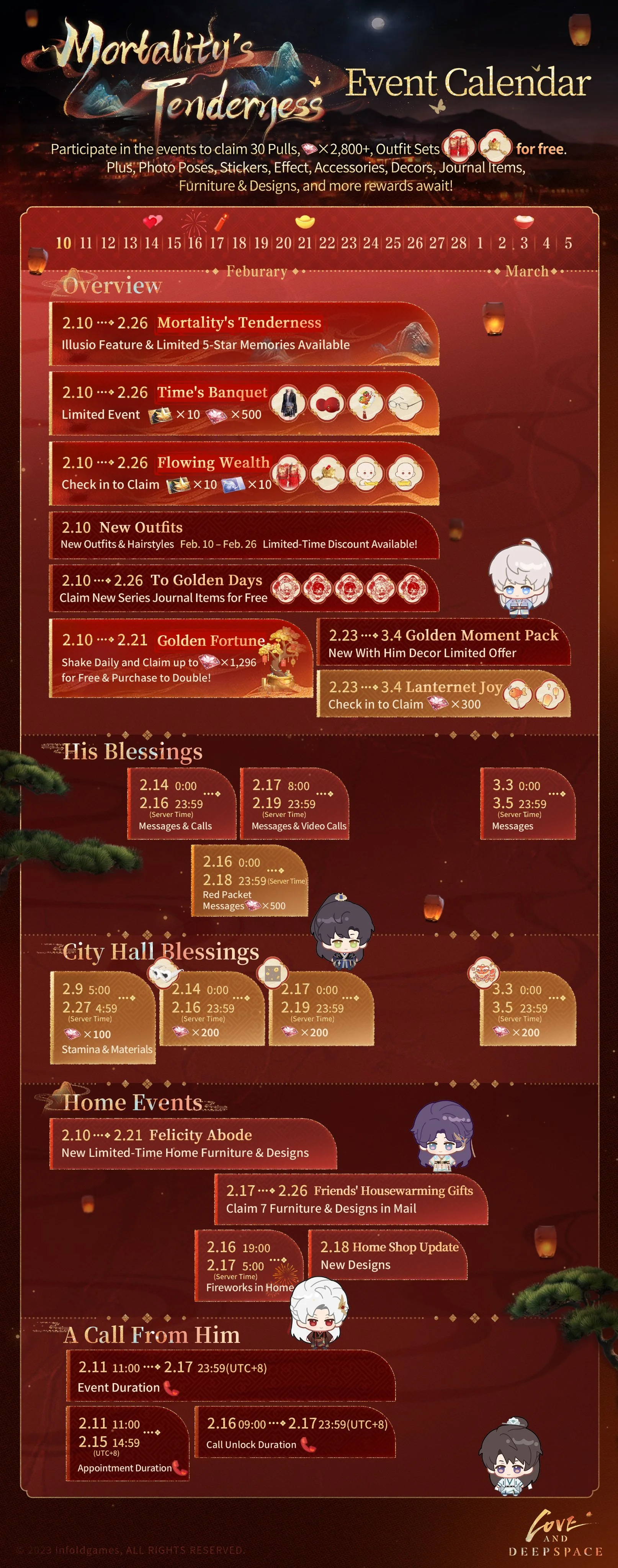 After 05:00 on Feb. 10 (server time), check in to the game, participate in the events, and receive messages and mails to claim various rewards for free including: [30 Pulls, Diamond*2,800+, His and "My" God of Wealth outfit sets], "My" Outfit, Photo Poses, Stickers, Effect, Accessories, Decors, Journal Items, Furniture & Designs, and more rewards await!