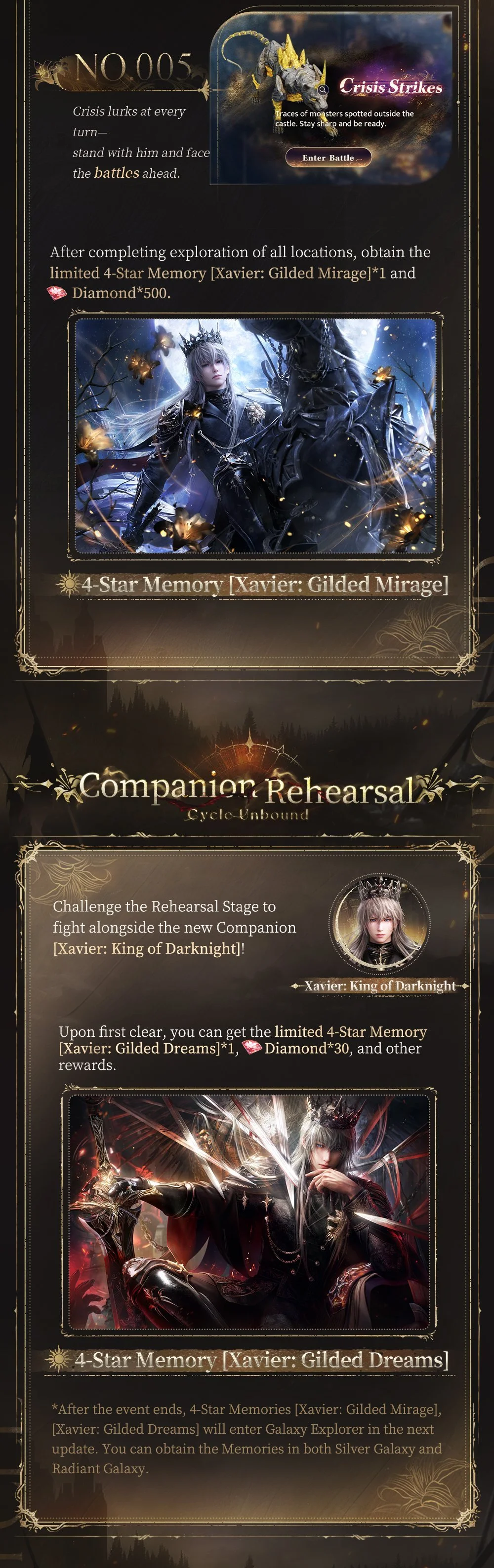 Investigating every area to obtain the exclusive 4-Star Memory [Xavier: Gilded Mirage] and [Diamond*500] at no cost!
