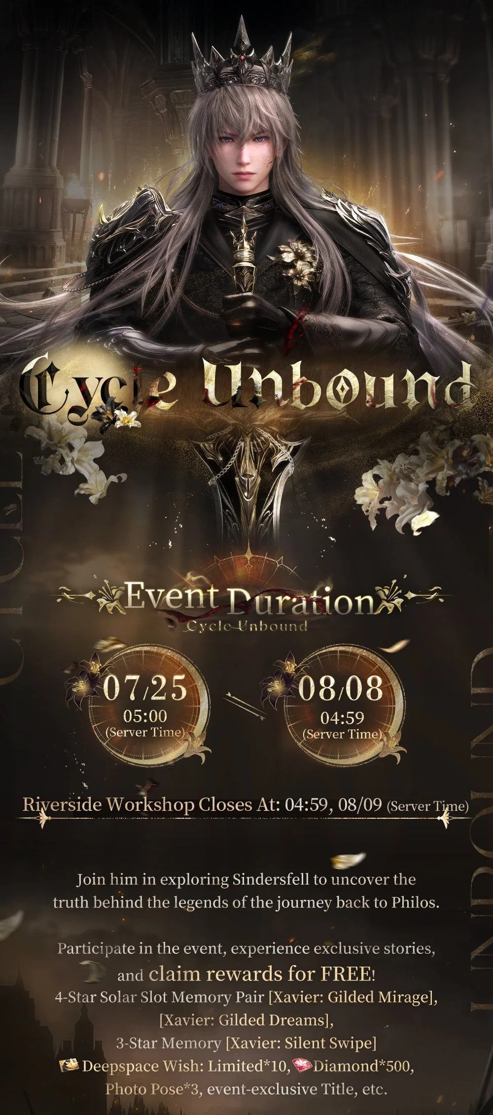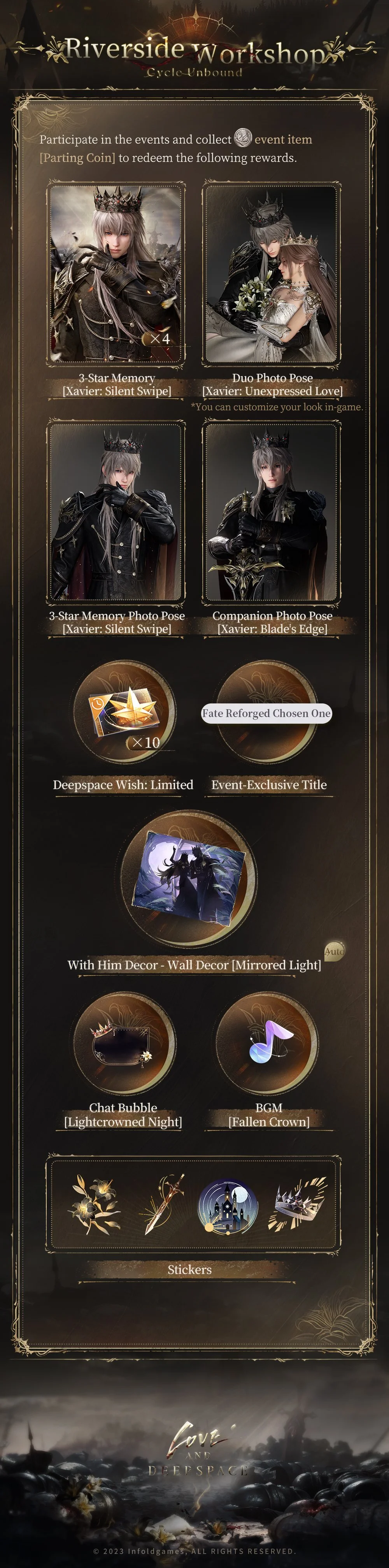 Get the 4-Star Solar-Slot Memory Pair [Xavier: Gilded Mirage] and [Xavier: Gilded Dreams], 3-Star Memory [Xavier: Silent Swipe], [Deepspace Wish: Limited*10], [Diamond*500], [Photo Pose*3], Event-exclusive Title, and other prizes for free by attending the event!