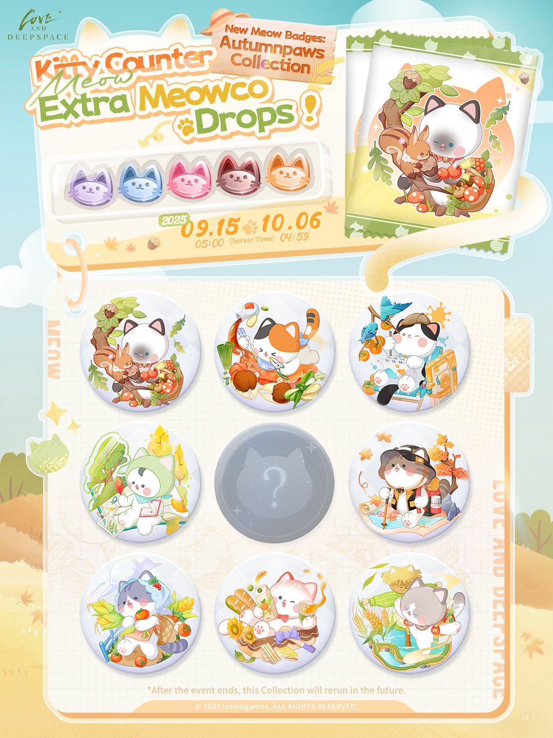 After the event ends, the Autumnpaws Meow Badges and other limited-time Meow Badges will rerun in the future. Please stay tuned to the Kitty Counter for the latest info!