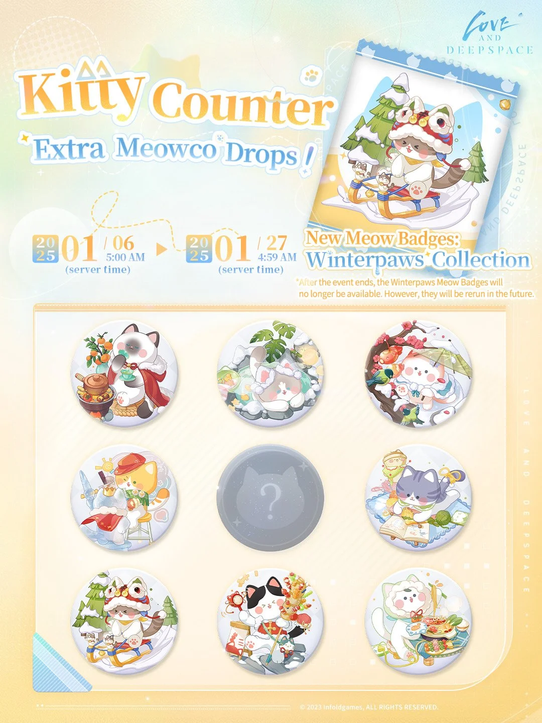 Collect exclusive Meowcos and visit the Kitty Counter to draw from the brand-new Meow Badges Series: [Winterpaws] Series!
