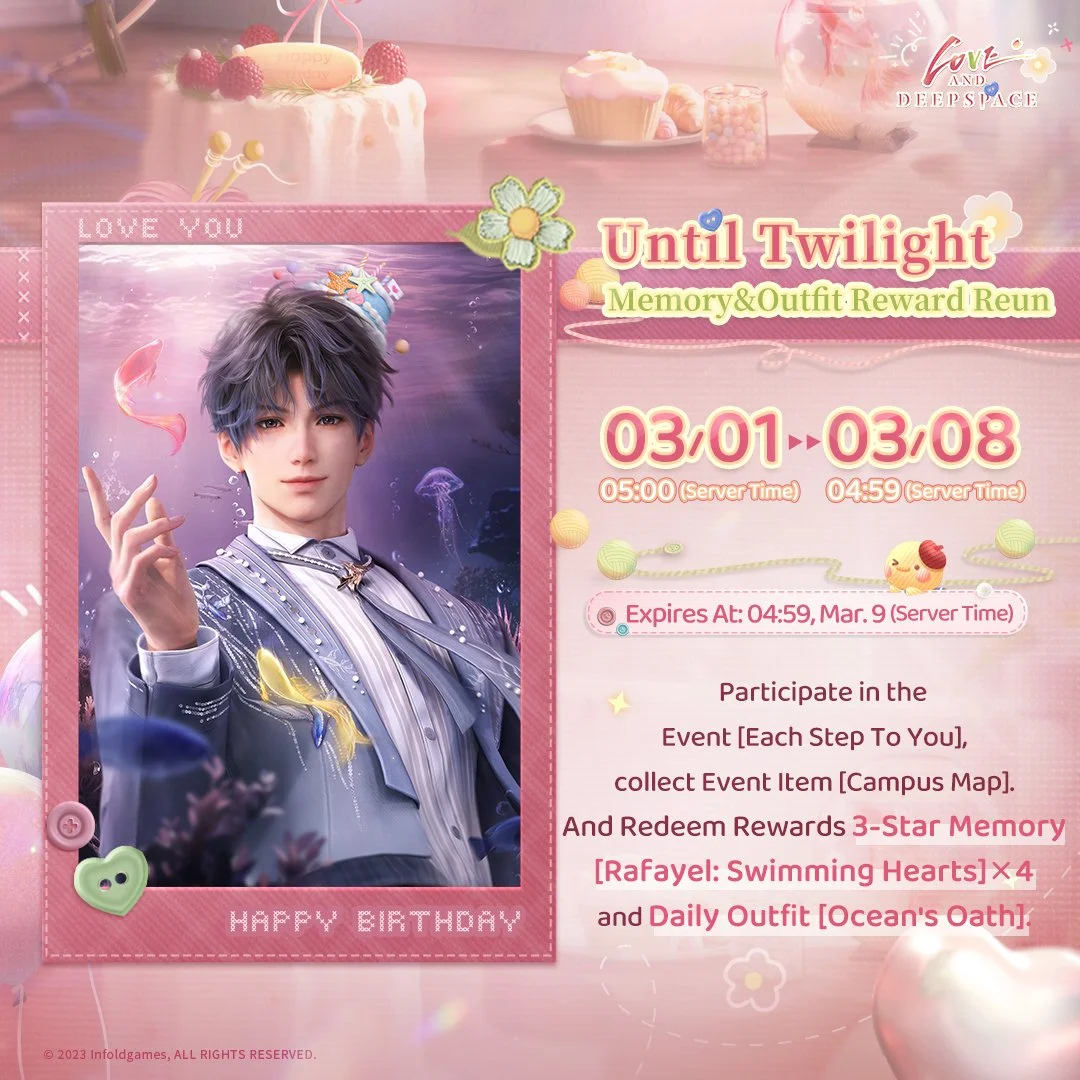Previous 5-Star Birthday Memories [Rafayel: Unforgettable Adventure] and [Rafayel: Boundless Seas] will be available for a limited time. Meanwhile, the 3-Star Memory & Outfit of the event [Until Twilight] will also be available!