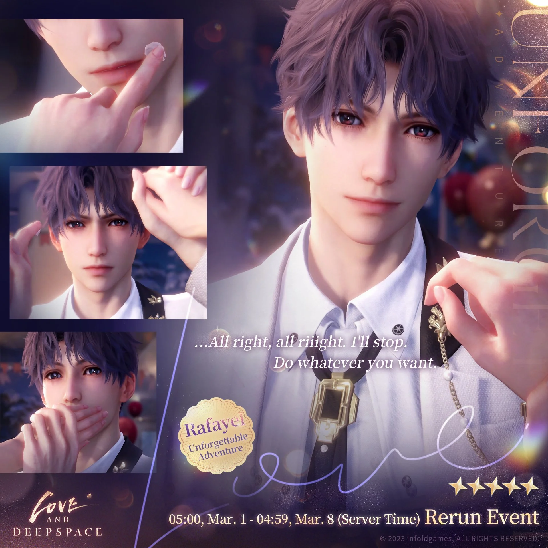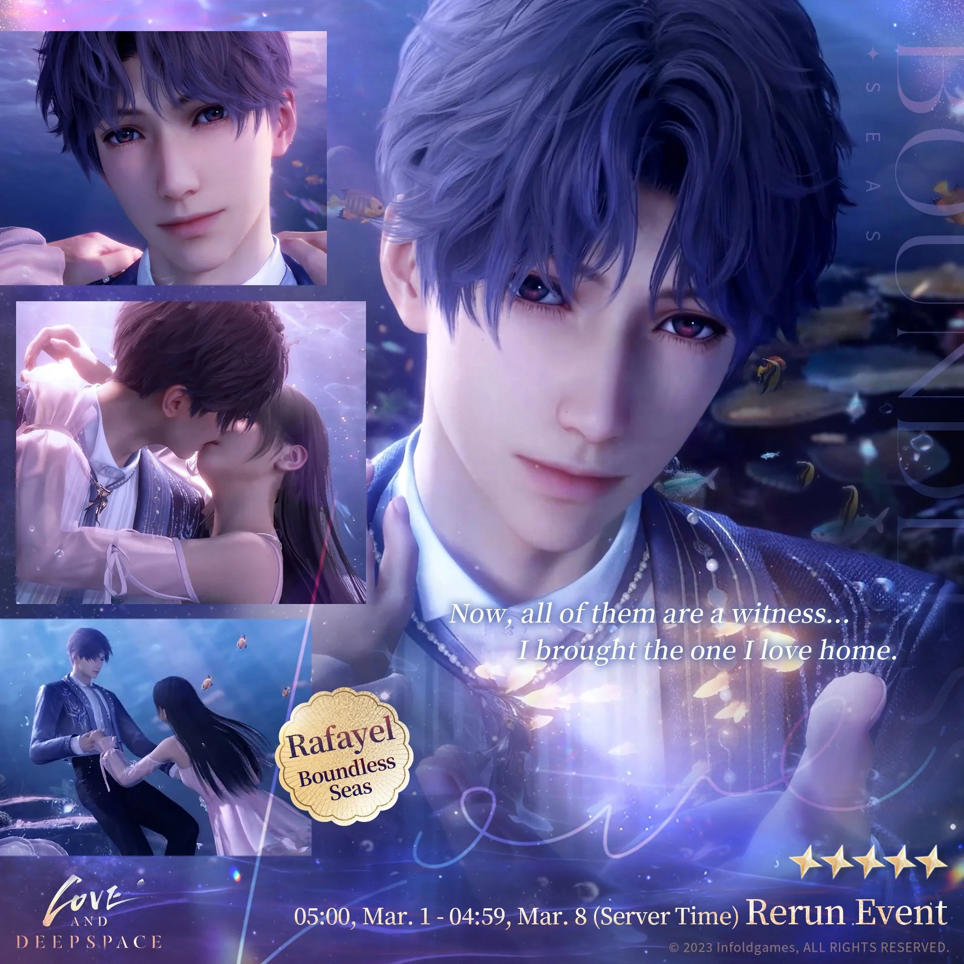 During the event, you can select one of the following limited 5-Star Memories, [Rafayel: Unforgettable Adventure] and [Rafayel: Boundless Seas], and make a wish with [Deepspace Wish] or [Time Wish: Limited]. The drop rate of the Limited 5-Star Memory you selected will go up drastically, and the unselected one won't be added to the Wish Pool.