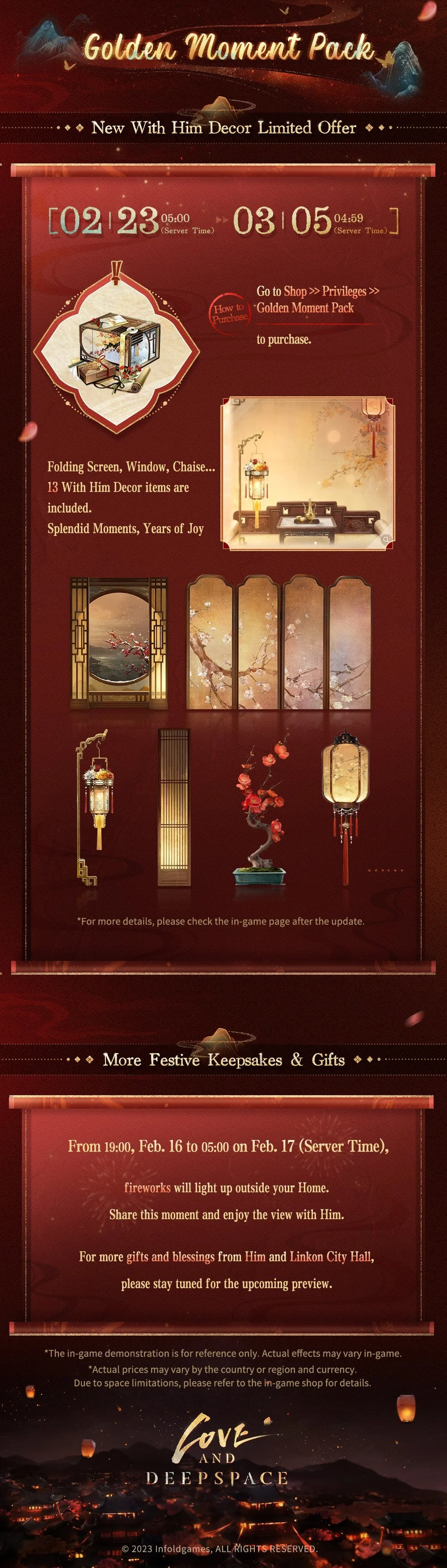 From 19:00, Feb. 16 to 05:00 on Feb. 17 (Server Time), fireworks will light up outside your Home. Share this moment and enjoy the view with Him.