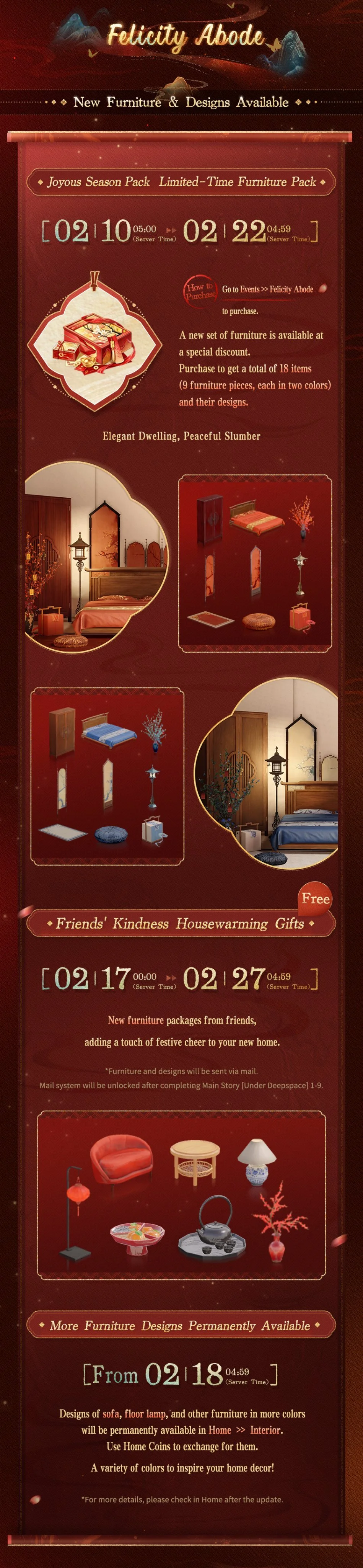 *Furniture and designs will be sent via mail. Mail system will be unlocked after completing Main Story [Under Deepspace] 1-9.