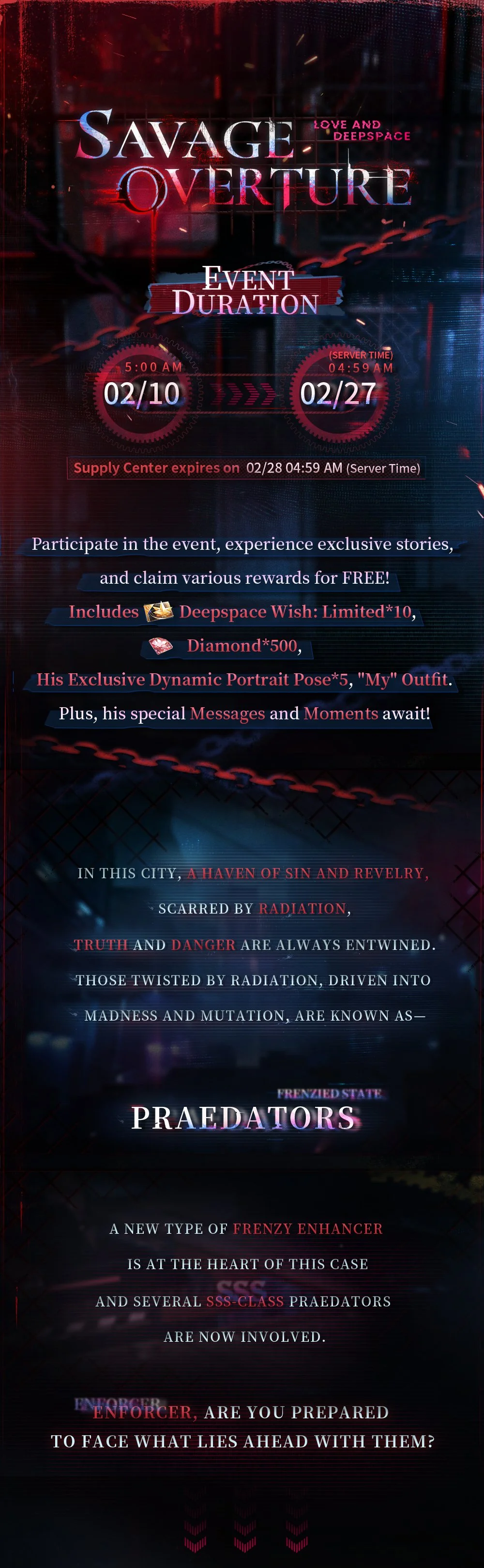 Participate in the event, enjoy the exclusive stories, and claim [Deepspace Wish: Limited*10], [Diamond*500], His Exclusive Dynamic Portrait Pose*5, "My" Outfit, and other rewards for FREE! Plus, enjoy His special messages and moments!