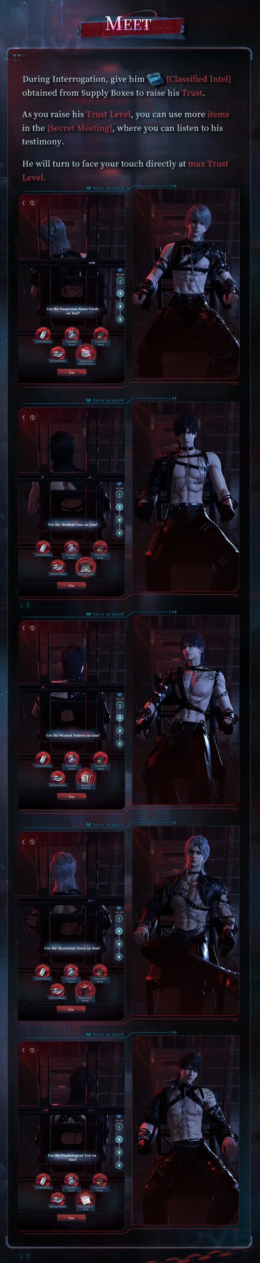 As you raise his Trust Level, you can use more items in the [Secret Meeting], where you can listen to his testimony.